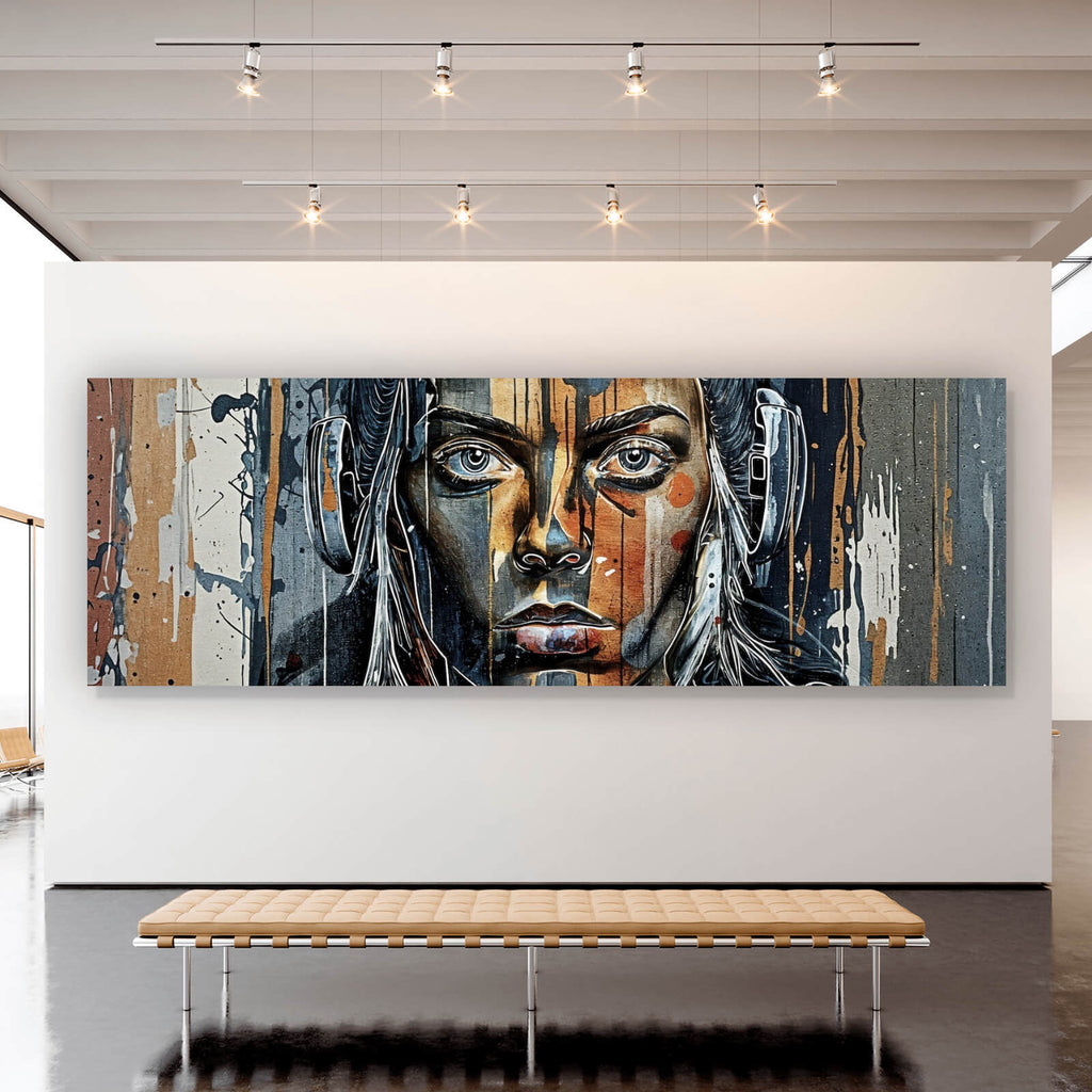 Diese beeindruckende Wandbild zeigt ein modernes, abstraktes Porträt einer Person mit Kopfhörern, das durch einen urbanen und zeitgenössischen Stil besticht. Die detaillierte Darstellung des Gesichts kombiniert mit den fließenden Linien und Tropfen, die sich über die gesamte Leinwand erstrecken, erzeugt eine dynamische und ausdrucksstarke Wirkung. Die Mischung aus verschiedenen Texturen und Stilen verleiht dem Bild eine besondere Tiefe und eine faszinierende Materialanmutung. Die Komposition wirkt sowohl kraftvoll als auch beruhigend und eignet sich ideal für moderne Wohnräume oder Büros, die eine kreative und stilvolle Atmosphäre fördern möchten. Das Bild zieht die Blicke auf sich und lädt den Betrachter ein, die Details und den Ausdruck des Porträts näher zu erkunden. Die künstlerische Kombination von Formen und Linien schafft ein einzigartiges visuelles Erlebnis, das perfekt in urbane und moderne Einrichtungskonzepte passt. Dieses Kunstwerk ist mehr als nur Dekoration; es ist ein Statement, das Individualität und kreativen Ausdruck in jedem Raum unterstreicht.