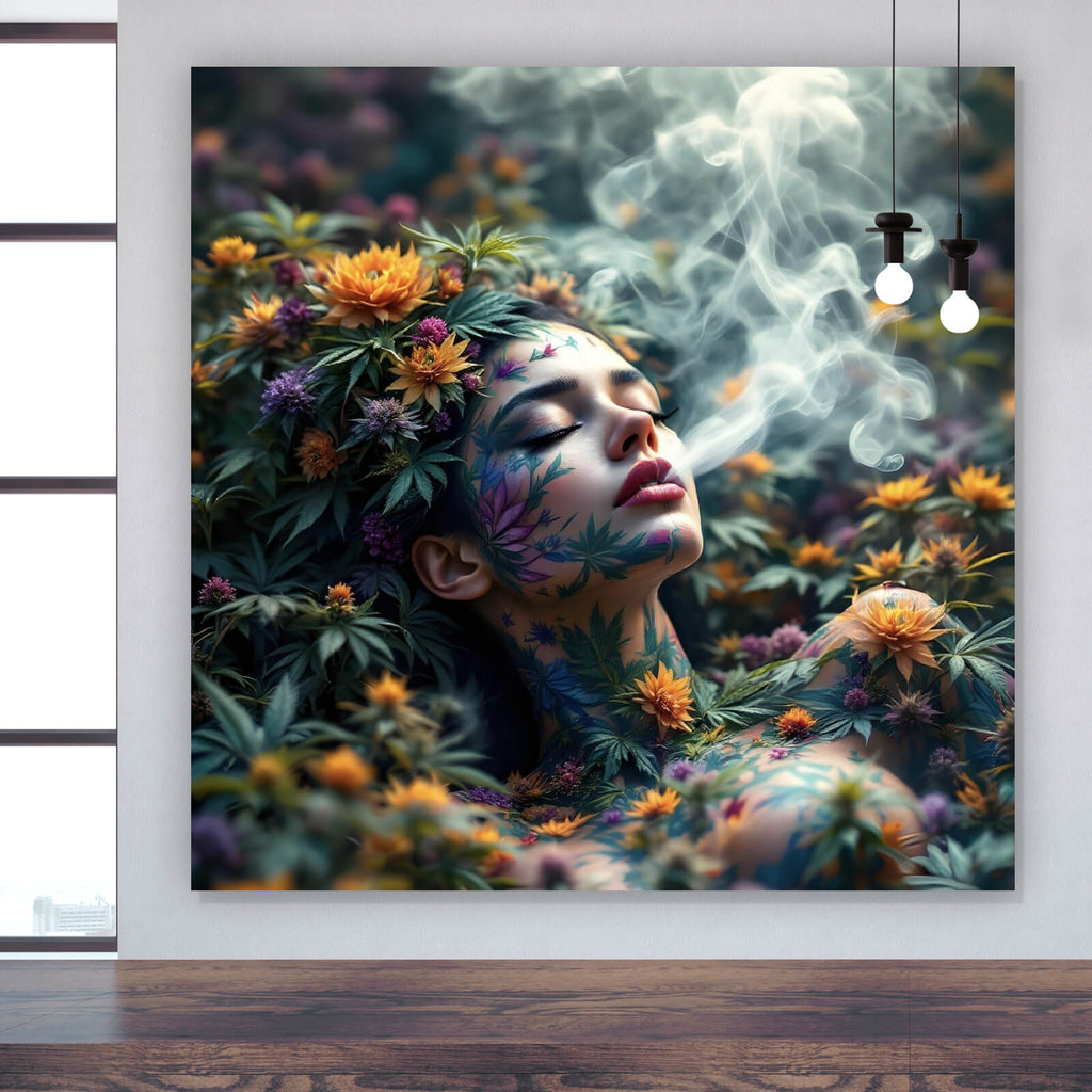 Auf der Suche nach einem ausgefallenen Wandbild als Acrylglasbild? Das Motiv Mystische rauchende Frau mit Blüten im Quadrat gefällt dir und du hast nach Wandbildern mit den Wörtern Frau, Mystik, Blüten, Blumen, Rauch, Gesicht, Natur, Entspannung, Meditation, Modern, Harmonie, Schönheit, Surrealität und Cannabis gesucht? Dann ist dieses Acrylglasbild in der Farbe Bunt genau das richtige Wandbild und Dekorelement für dich! Setze ein Highlight an deiner Wand! Das Acrylglasbild Mystische rauchende Frau mit Blüten ist in 4 verschiedenen Größen verfügbar, von klein und dezent bis hin zum XXL Acrylglasbild.