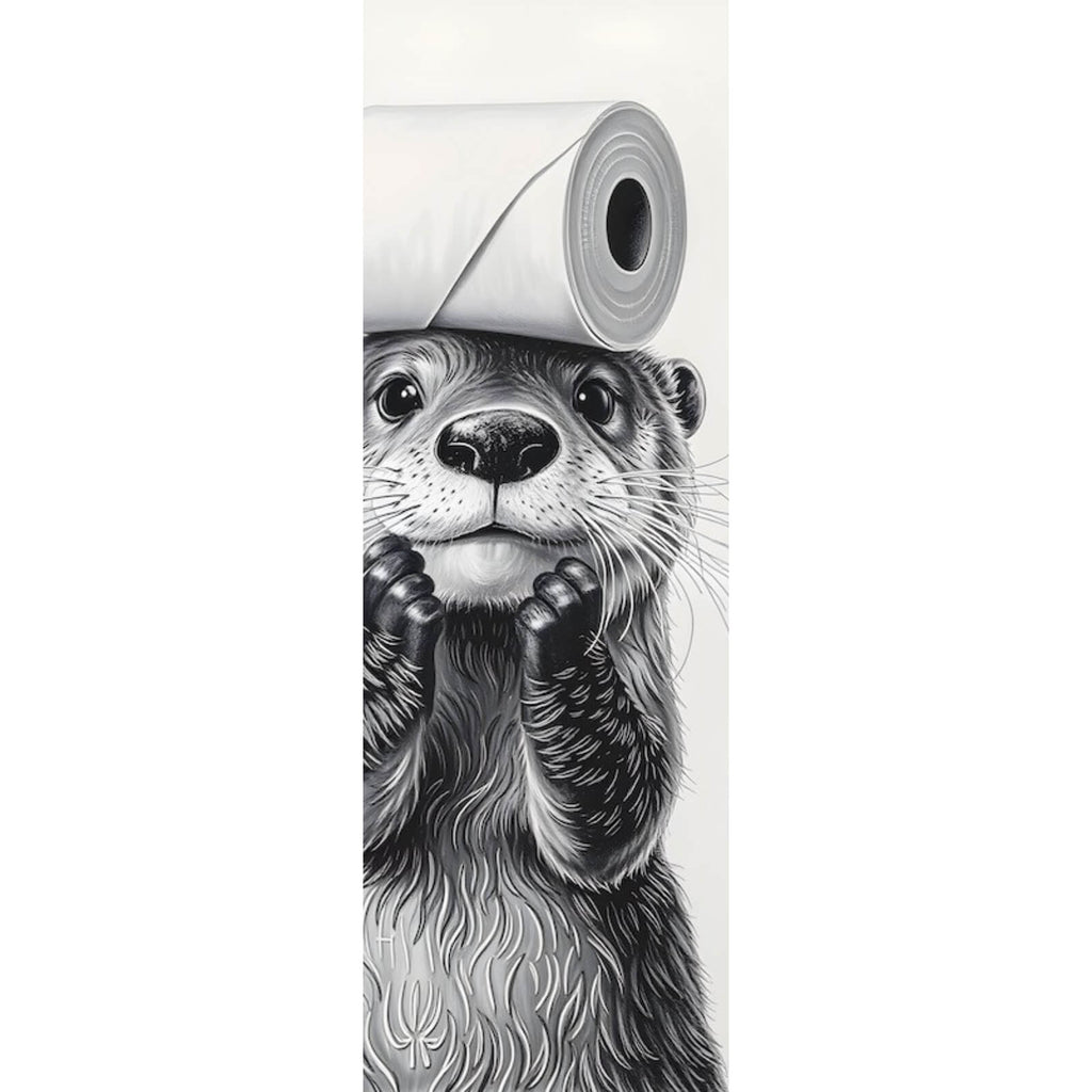 Auf dem Bild ist eine bezaubernde Zeichnung eines Otters zu sehen, der auf humorvolle Weise eine Rolle Toilettenpapier auf dem Kopf balanciert. Der Otter ist in einem monochromen Schwarz-Weiß-Stil illustriert, was der Darstellung einen klassischen und stilvollen Look verleiht. Seine großen, neugierigen Augen und die leicht hochgezogenen Pfoten lassen ihn besonders niedlich und verspielt erscheinen. Die Details in seinem Fell sind sorgfältig ausgearbeitet, wodurch der Otter lebendig und realistisch wirkt. Das Toilettenpapier, das untypisch auf dem Kopf des Tieres platziert ist, fügt dem Bild eine humorvolle Note hinzu, die den Betrachter zum Schmunzeln bringt. Die gesamte Komposition ist minimalistisch gehalten, mit einem glatten, hellen Hintergrund, der den Fokus vollständig auf den charmanten Otter lenkt. Diese Illustration eignet sich hervorragend als dekoratives Element in einem modernen Raum oder als Teil einer humorvollen Kunstsammlung. Sie spricht Tierliebhaber und Kunstfreunde gleichermaßen an und vermittelt eine fröhliche, unbeschwerte Stimmung.