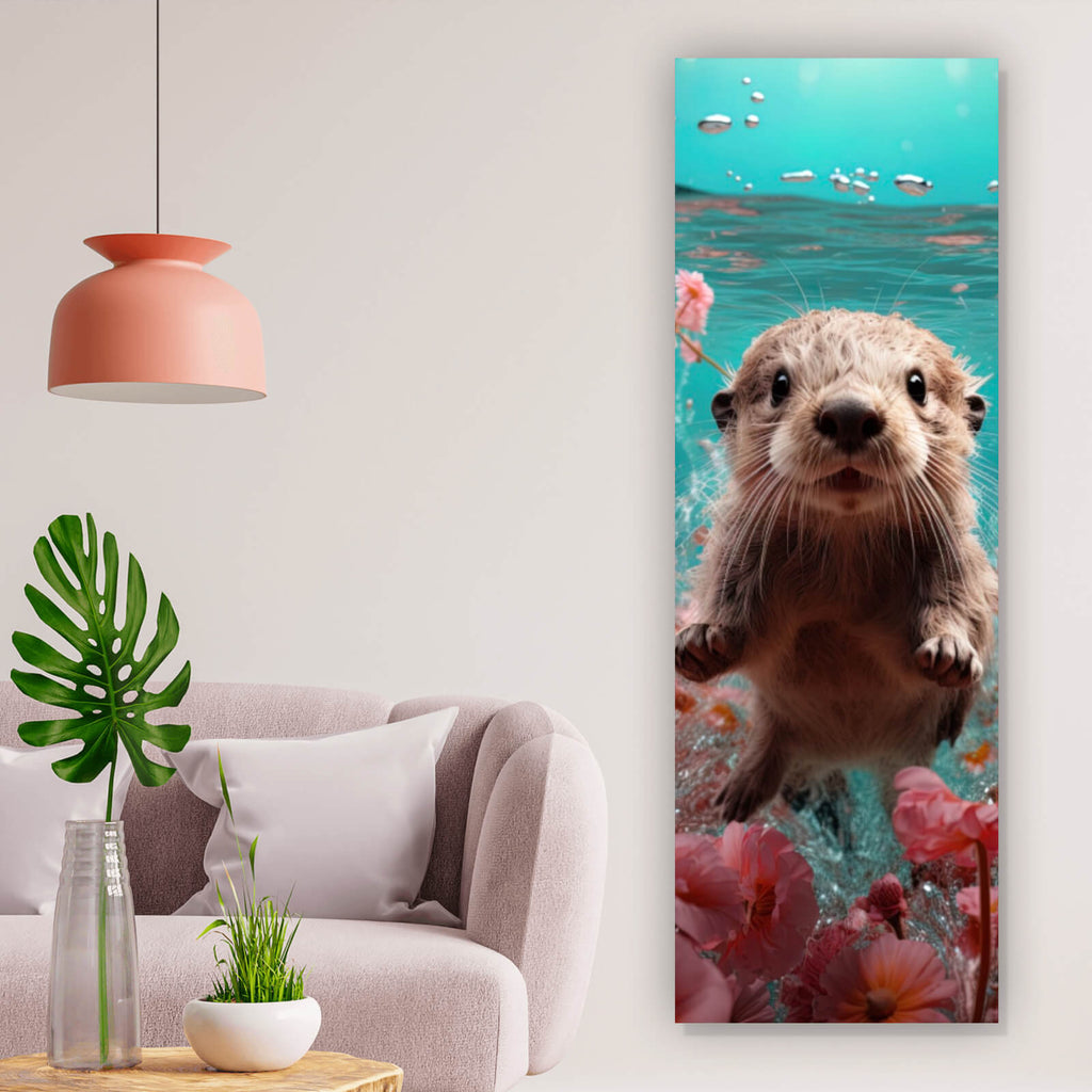 Dieses Wandbild zeigt ein niedliches Ottermotiv, das in einem lebendigen und erfrischenden Stil gestaltet ist. Der Otter ist umgeben von einer Vielzahl von Blumen und Wasser, was dem Bild eine dynamische und lebendige Atmosphäre verleiht. Die Anordnung der Formen und Details vermittelt ein Gefühl von Frische und Natürlichkeit. Der Ausdruck des Otters ist freundlich und neugierig, was das Bild zu einem einladenden und fröhlichen Kunstwerk macht. Diese Darstellung eignet sich hervorragend für Räume, die eine lebendige und erfrischende Atmosphäre benötigen, wie Wohnzimmer, Kinderzimmer oder auch Büros und Praxen. Der Stil des Bildes ist modern und kreativ, was es zu einem idealen Element für eine ansprechende Inneneinrichtung macht. Die Materialanmutung des Bildes suggeriert Tiefe und Beweglichkeit, wodurch es dem Betrachter das Gefühl gibt, in eine andere Welt einzutauchen. Die Kombination aus floralen Elementen und Wasser vermittelt eine harmonische und entspannende Wirkung, die perfekt für eine beruhigende Umgebung ist. Dieses Wandbild ist nicht nur ein dekoratives Element, sondern auch eine Inspirationsquelle für Kreativität und Lebensfreude.