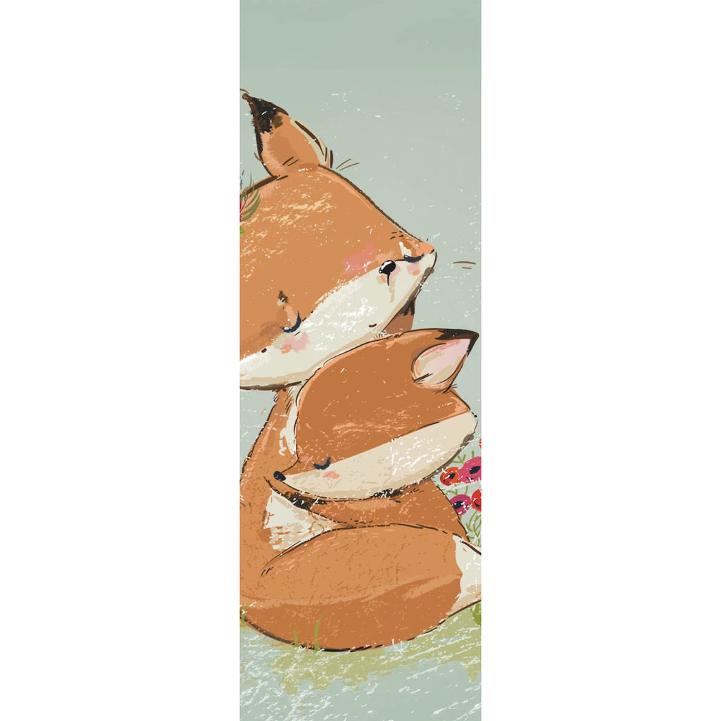 Das Wandbild zeigt eine liebevolle Szene zweier Füchse in inniger Umarmung, die perfekt geeignet ist, um eine warme und einladende Atmosphäre im Kinderzimmer zu schaffen. Diese Illustration strahlt eine bezaubernde Niedlichkeit aus, die sowohl Kinder als auch Erwachsene anspricht. Der sanfte Stil und die harmonische Darstellung der Tiere vermitteln ein Gefühl von Geborgenheit und Ruhe, ideal für eine entspannende Umgebung. Die detaillierte Ausarbeitung der Fuchsgesichter und die Anordnung der Blumen im Hintergrund verleihen dem Bild eine lebendige Tiefe und machen es zu einem Blickfang an jeder Wand. Die Komposition des Bildes eignet sich hervorragend als zentrales Dekorationselement und kann wunderbar mit anderen Natur- und Tiermotiven kombiniert werden. Dieses Kunstwerk ist nicht nur dekorativ, sondern auch inspirierend, da es die Schönheit und Harmonie der Natur in einem modernen Kontext einfängt. Die Verwendung von verspielten Formen und die sanfte Linienführung erhöhen die visuelle Attraktivität und machen es zu einem stilvollen Accessoire für jedes Zuhause. Ideal für Familien, die nach einer kreativen und stilvollen Möglichkeit suchen, ihre Räume zu gestalten.