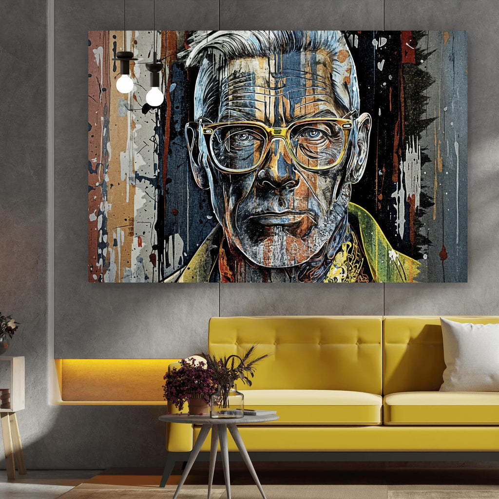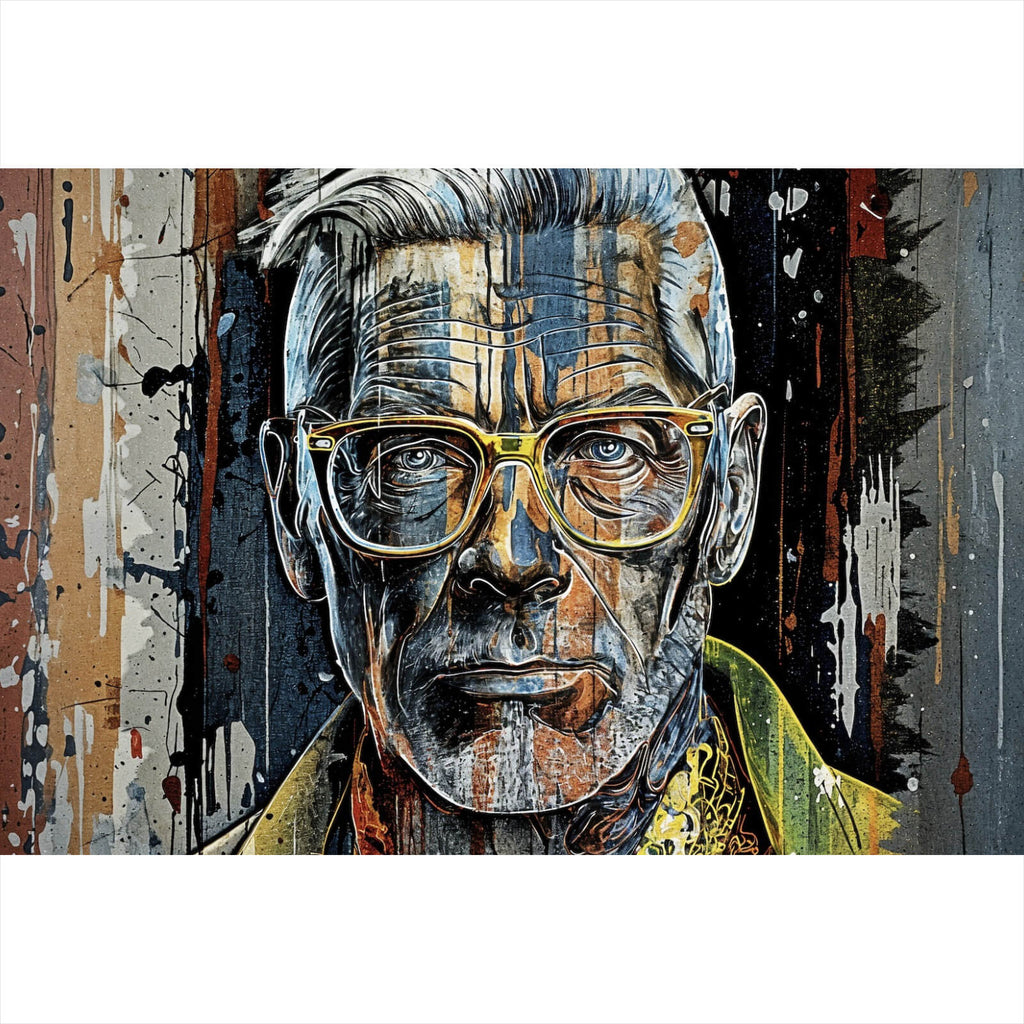 Das beeindruckende Wandbild zeigt ein modernes Portrait, das durch seine einzigartige Spritztechnik eine besondere Dynamik und Ausdruckskraft erhält. Die Kombination aus abstrakten Elementen und präzisen Konturen verleiht dem Werk eine faszinierende Tiefe und zieht den Betrachter in seinen Bann. Die dargestellte Person, mit markanten Gesichtszügen und stilvoller Brille, vermittelt eine starke Präsenz und lässt Raum für Interpretationen. Die verschiedenen Ebenen des Bildes, erzeugt durch die geschickte Anwendung der Spritztechnik, schaffen eine lebendige Struktur, die sowohl in modernen Wohnräumen als auch in kreativen Arbeitsumgebungen eine inspirierende Atmosphäre schafft. Die Mischung aus urbanem Grunge und klassischer Portraitkunst macht dieses Werk zu einem Highlight für Kunstliebhaber und Dekorationsbegeisterte. Es eignet sich perfekt, um in Wohnzimmern, Büros oder Praxen Akzente zu setzen und eine stilvolle, trendige Umgebung zu schaffen. Die künstlerische Raffinesse und der innovative Stil des Bildes garantieren, dass es sowohl als dekoratives Element als auch als Gesprächsanlass dient.