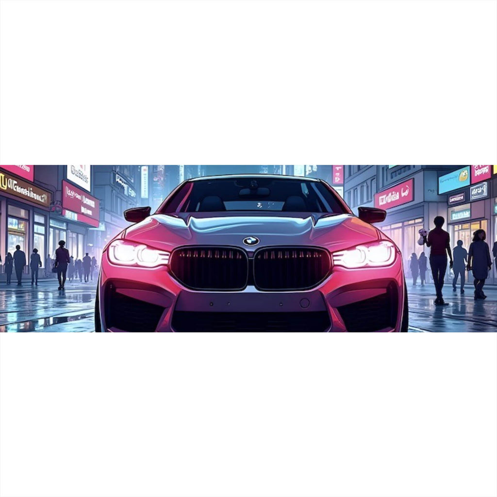 Das Bild zeigt ein futuristisches Auto, das im Vordergrund einer belebten städtischen Szene unter nächtlichem Himmel steht. Die Umgebung ist von hoch aufragenden Gebäuden gesäumt, deren Fassaden mit leuchtenden Neonlichtern geschmückt sind. Diese Lichter werfen bunte Reflexionen auf die nasse Straße, was auf einen kürzlichen Regenfall hinweist. Die Kombination aus kräftigen Rottönen der Bremslichter und den kalten Blautönen der Umgebung erzeugt eine dynamische und kontrastreiche Atmosphäre.