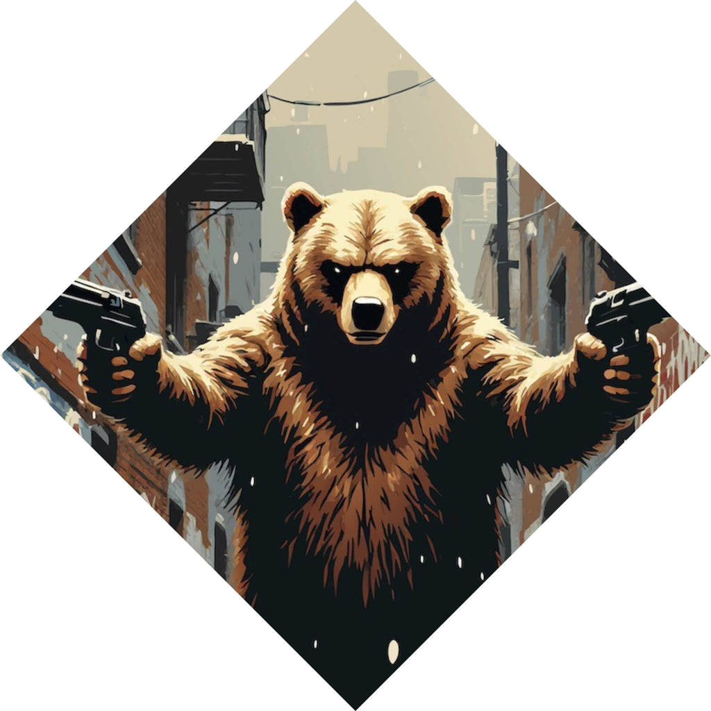 Das Bild zeigt eine surreale und humorvolle Szene, in der ein großer Bär in einer engen, schneebedeckten Stadtgasse steht. Der Bär hat eine beeindruckende Präsenz und hält in jeder seiner Tatzen eine Pistole, was der Szene eine unerwartete und bedrohliche Note verleiht. Die Gasse ist von hohen Ziegelwänden flankiert, die mit lebhaften Graffitis bedeckt sind, was auf eine urbane Umgebung hindeutet. Der Boden ist mit einer dünnen Schneeschicht bedeckt, und vereinzelte Schneeflocken fallen sanft vom Himmel, was die winterliche Atmosphäre verstärkt. Im Hintergrund sind Feuerleitern und Stromleitungen zu sehen, die das typische Stadtbild einer engen Gasse vervollständigen. Die Farbpalette des Bildes wird von Brauntönen dominiert, die das Fell des Bären charakterisieren, während Grautöne und Rottöne die Wände und die Umgebung definieren. Die Szene ist künstlerisch gestaltet und kombiniert Realität mit einer Prise Fantasie, was beim Betrachter Neugier und ein Schmunzeln hervorruft.
