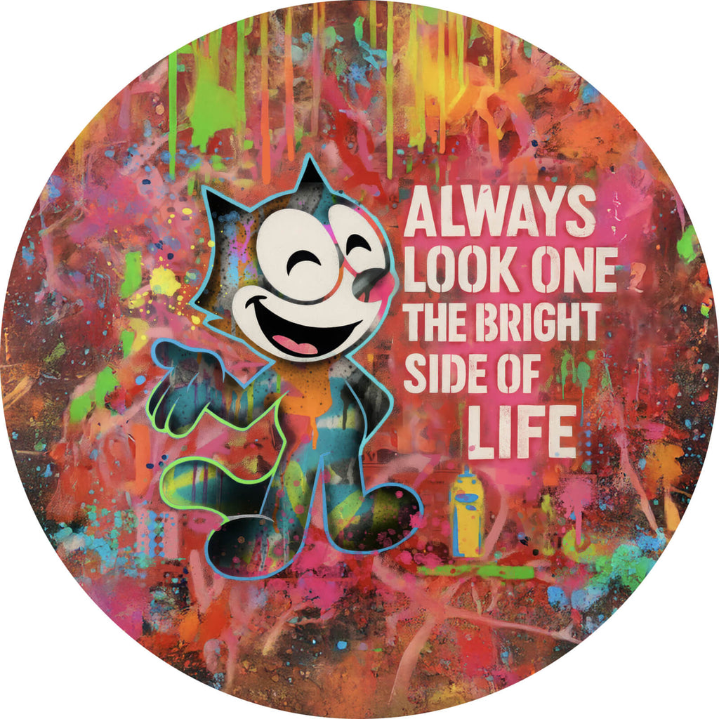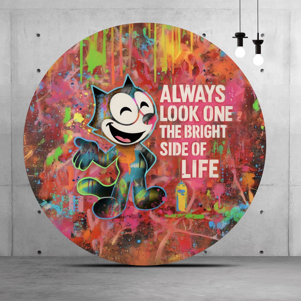 Das Bild zeigt eine fröhliche Cartoon-Katze, die lebhaft vor einem Hintergrund aus Graffiti und bunten Farben steht. Die Katze ist in einem dynamischen Stil dargestellt, umgeben von einer Vielzahl von kräftigen Farben wie Orange, Pink, Blau und Grün, die für eine lebendige und energiegeladene Atmosphäre sorgen. Links von der Katze befindet sich das inspirierende Zitat „ALWAYS LOOK ON THE BRIGHT SIDE OF LIFE“, das in großen, weißen Buchstaben geschrieben ist. Der Hintergrund besteht aus einer Vielzahl von Farbspritzern und Tropfen, die wild und künstlerisch über die Oberfläche verteilt sind, was dem Bild eine moderne, urbane Ästhetik verleiht. Rechts unten ist eine gelbe Sprühdose zu sehen, die auf die Entstehung der Graffiti hinweist und den kreativen Schaffensprozess unterstreicht. Insgesamt vermittelt das Bild eine positive und lebensbejahende Botschaft, die durch die bunte und lebhafte Darstellung ergänzt wird. Es lädt den Betrachter ein, das Leben aus einer optimistischen Perspektive zu betrachten und die Farben und Freuden des Alltags zu schätzen