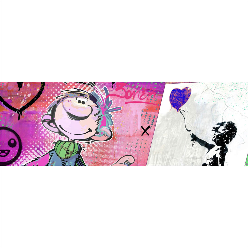 Auf der Suche nach einem ausgefallenen Wandbild als Aluminiumbild? Das Motiv Comicfigur mit Spraydose im Graffiti Stil im Panorama gefällt dir und du hast nach Wandbildern mit den Wörtern Graffiti, Künstler, Spraydose, Malerei, Pop Art, Street Art, Urban, Herzballon, Symbole, Kreativität, Comic und Männchen gesucht? Dann ist dieses Aluminiumbild in der Farbe Bunt genau das richtige Wandbild und Dekorelement für dich! Setze ein Highlight an deiner Wand! Das Aluminiumbild Comicfigur mit Spraydose im Graffiti Stil ist in 3 verschiedenen Größen verfügbar, von klein und dezent bis hin zum XXL Aluminiumbild.