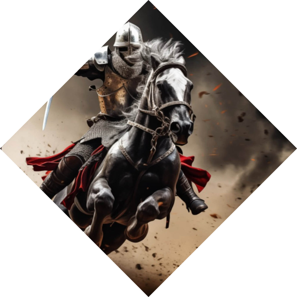 Auf der Suche nach einem ausgefallenen Wandbild als Aluminiumbild? Das Motiv Dramatische Ritter auf stürmischen Schlachtrossen als Raute gefällt dir und du hast nach Wandbildern mit den Wörtern Ritter, Pferde, Helden, Schlacht, Rüstung, Episch, Abenteuer, Dynamik, Mittelalter, Kampf, Action, Dramatisch, Reiter, Historisch, Krieg, Spannung, Intensität, Energie, Stärke und Tradition gesucht? Dann ist dieses Aluminiumbild in der Farbe Bunt genau das richtige Wandbild und Dekorelement für dich! Setze ein Highlight an deiner Wand! Das Aluminiumbild Dramatische Ritter auf stürmischen Schlachtrossen ist in 4 verschiedenen Größen verfügbar, von klein und dezent bis hin zum XXL Aluminiumbild.