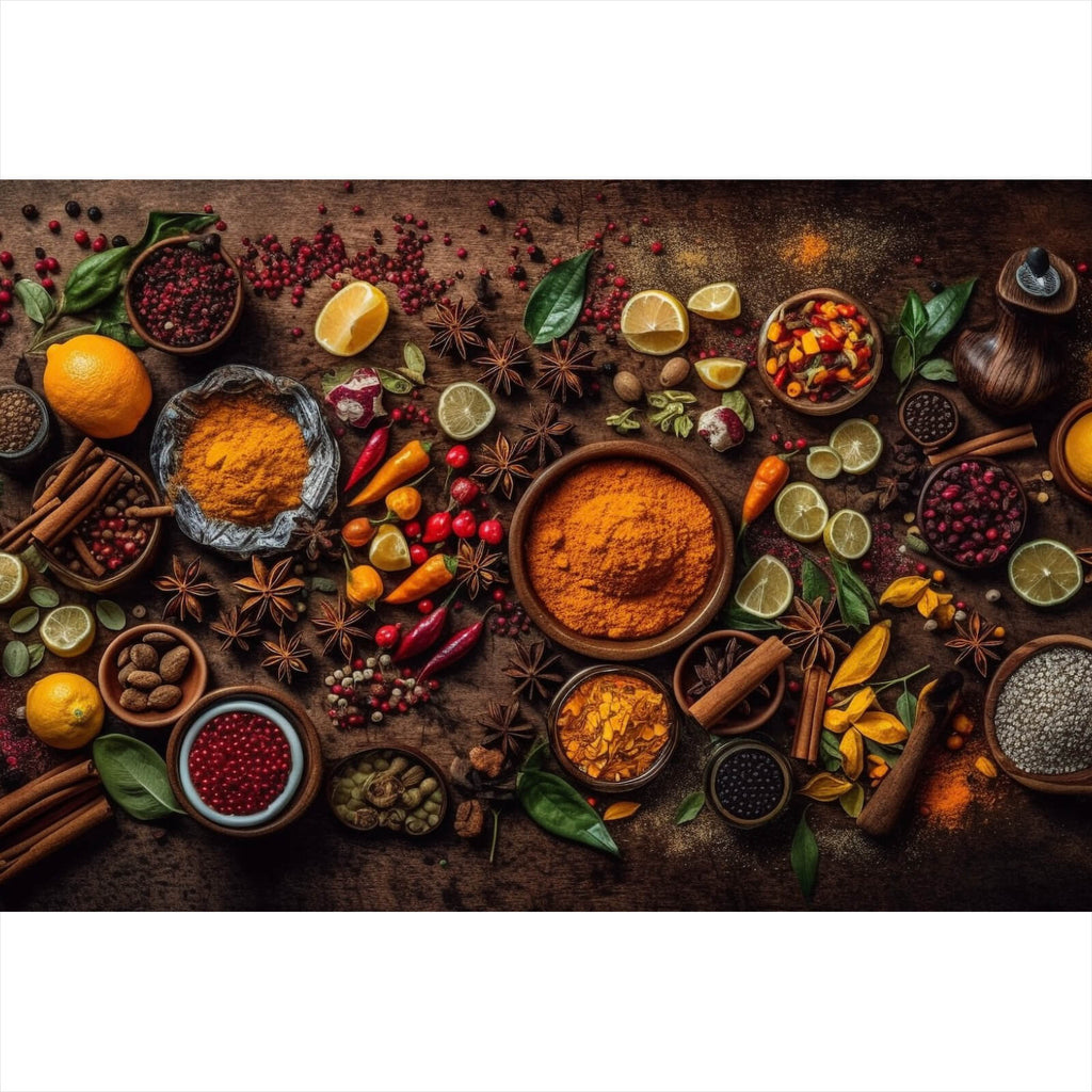 Dieses beeindruckende Wandbild zeigt eine Vielzahl exotischer Gewürze kunstvoll arrangiert auf einem rustikalen Holztisch. Die Komposition aus verschiedenen Formen und Texturen verleiht dem Bild eine lebendige und einladende Atmosphäre. Das Bild fängt die Essenz von kulinarischer Vielfalt und kreativer Gestaltung ein, indem es eine Vielzahl von Gewürzen und Zutaten darstellt, die in harmonischem Einklang miteinander stehen. Die Anordnung der Elemente und die natürliche Materialanmutung des Holztisches schaffen eine warme und einladende Stimmung, die ideal für Küchen, Esszimmer oder gastronomische Einrichtungen geeignet ist. Die Detailgenauigkeit der verschiedenen Gewürze und deren Präsentation lassen den Betrachter in eine Welt voller Aromen und Geschmacksnoten eintauchen, was dem Raum Tiefe und Charakter verleiht. Dieses Kunstwerk ist mehr als nur eine Dekoration; es ist eine Einladung, die Sinne zu beleben und die Schönheit der Natur in den Alltag zu integrieren. Die Kombination aus traditionellem und modernem Stil macht dieses Bild zu einem perfekten Akzent für jedes Interieur, das sowohl Ästhetik als auch Funktionalität vereint.