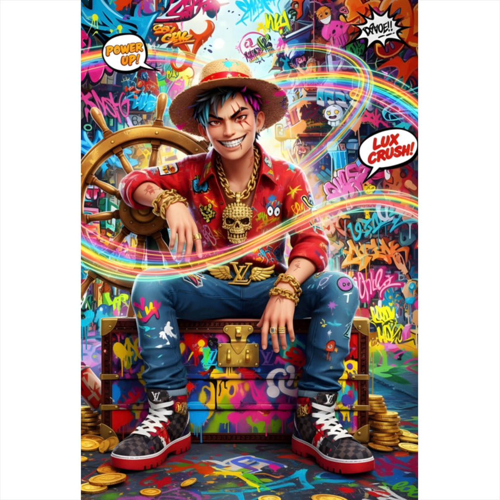 Dieses beeindruckende Wandbild vereint urbanes Graffiti mit lebendigen Cartoon-Elementen und schafft so eine dynamische und energiegeladene Atmosphäre. Im Vordergrund steht eine markante Figur mit einem ausdrucksstarken Gesichtsausdruck, die von einer Vielzahl an grafischen Elementen und stilisierten Schriftzügen umgeben ist. Die Komposition ist geprägt von einer Vielzahl an Details, die das Auge des Betrachters immer wieder auf neue Entdeckungen stoßen lassen. Der Hintergrund ist reich an texturierten Schichten und bietet eine Tiefe, die den Raum zum Leben erweckt. Moderne und traditionelle Kunststile verschmelzen hier zu einem einzigartigen visuellen Erlebnis, das sowohl Ausdruckskraft als auch Kreativität verkörpert. Die Szene strahlt eine jugendliche und rebellische Stimmung aus, die perfekt in moderne Wohn- und Arbeitsbereiche passt. Die Materialanmutung des Bildes vermittelt einen Hauch von Street Art, während die klaren Linien und Formen für eine moderne Ästhetik sorgen. Ideal für alle, die ihren Raum mit einem Hauch von Individualität und stilvollem Flair bereichern möchten.
