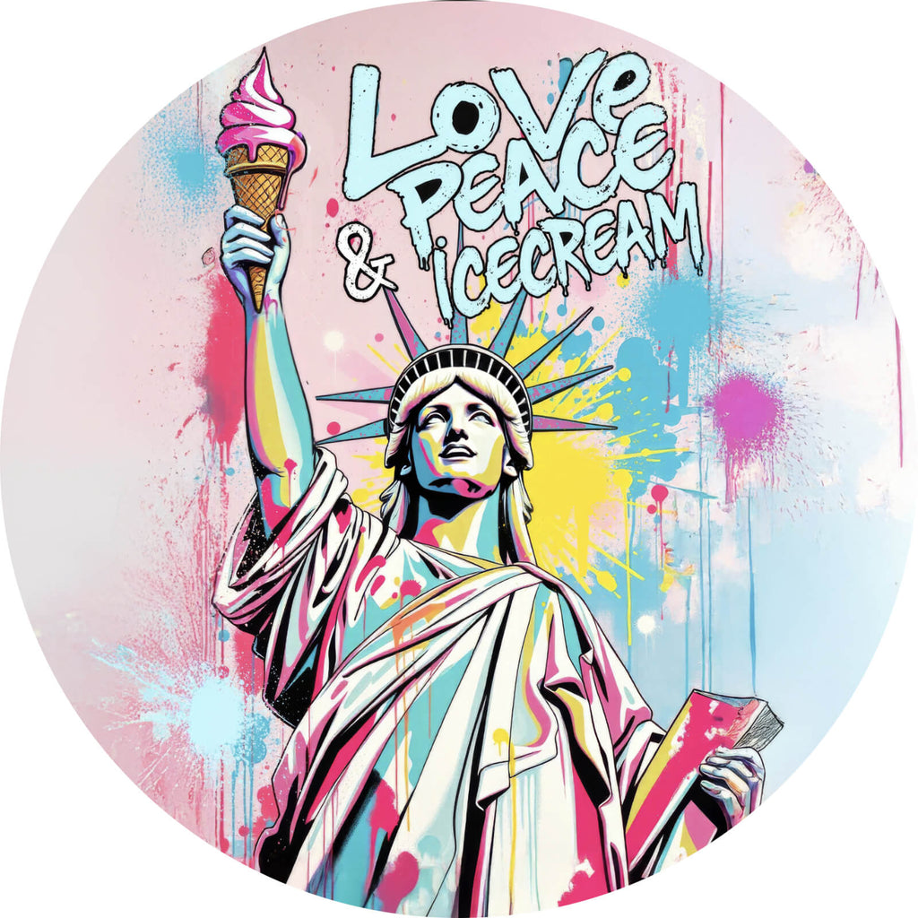 Das Bild zeigt eine kreative und moderne Interpretation der Freiheitsstatue, die in einem lebhaften Pop-Art-Stil dargestellt ist. Die Statue hält anstelle der traditionellen Fackel ein Eis in der Hand, was dem Kunstwerk eine humorvolle und unkonventionelle Note verleiht. Umgeben von lebhaften Farbspritzern in Pink, Blau und Gelb, vermittelt das Bild eine fröhliche und dynamische Atmosphäre. Hinter der Statue sind die Wörter "Love, Peace & Icecream" in großen, verspielten Buchstaben zu sehen, die das Thema des Bildes verstärken. Diese Kombination aus ikonischem Symbol und moderner Kunstform spricht ein urbanes und junges Publikum an, das nach Ausdruck und Individualität strebt. Die Verwendung von Graffiti-Elementen verleiht dem Bild eine zusätzliche Tiefe und verbindet traditionelle Symbole mit zeitgenössischer Kunst. Diese Darstellung könnte in einer urbanen Galerie oder als Streetart in einer Großstadt wie New York zu finden sein und spiegelt die kulturelle Vielfalt und den kreativen Geist der modernen Kunstszene wider.