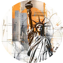 Das Bild zeigt die Freiheitsstatue in einem künstlerischen, abstrakten Stil, der moderne und klassische Elemente kombiniert. Im Vordergrund steht die ikonische Statue, die für Freiheit und Demokratie steht. Sie ist detailliert dargestellt, mit klaren Linien und Schattierungen, die ihre berühmte Silhouette betonen. Die Fackel und die Krone der Statue sind deutlich zu erkennen. Im Hintergrund ist eine stilisierte Skyline von New York zu sehen, die teilweise in Grautönen gehalten ist. Die Gebäude sind schematisch und skizzenhaft angedeutet, was dem Bild einen modernen, urbanen Charakter verleiht. Besonders auffällig ist der orangefarbene Streifen, der vertikal durch das Bild verläuft und ihm eine lebendige Dynamik verleiht. Die Kombination aus architektonischen Elementen, geometrischen Formen und technischen Zeichnungen schafft eine interessante Spannung zwischen Tradition und Moderne. Diese künstlerische Darstellung fängt nicht nur die Essenz der Freiheitsstatue ein, sondern auch den Puls der Stadt New York als ein Symbol für Fortschritt und Entwicklung. Das Bild vermittelt ein Gefühl von Bewegung und Energie, das typisch für das Leben in einer Metropole ist.
