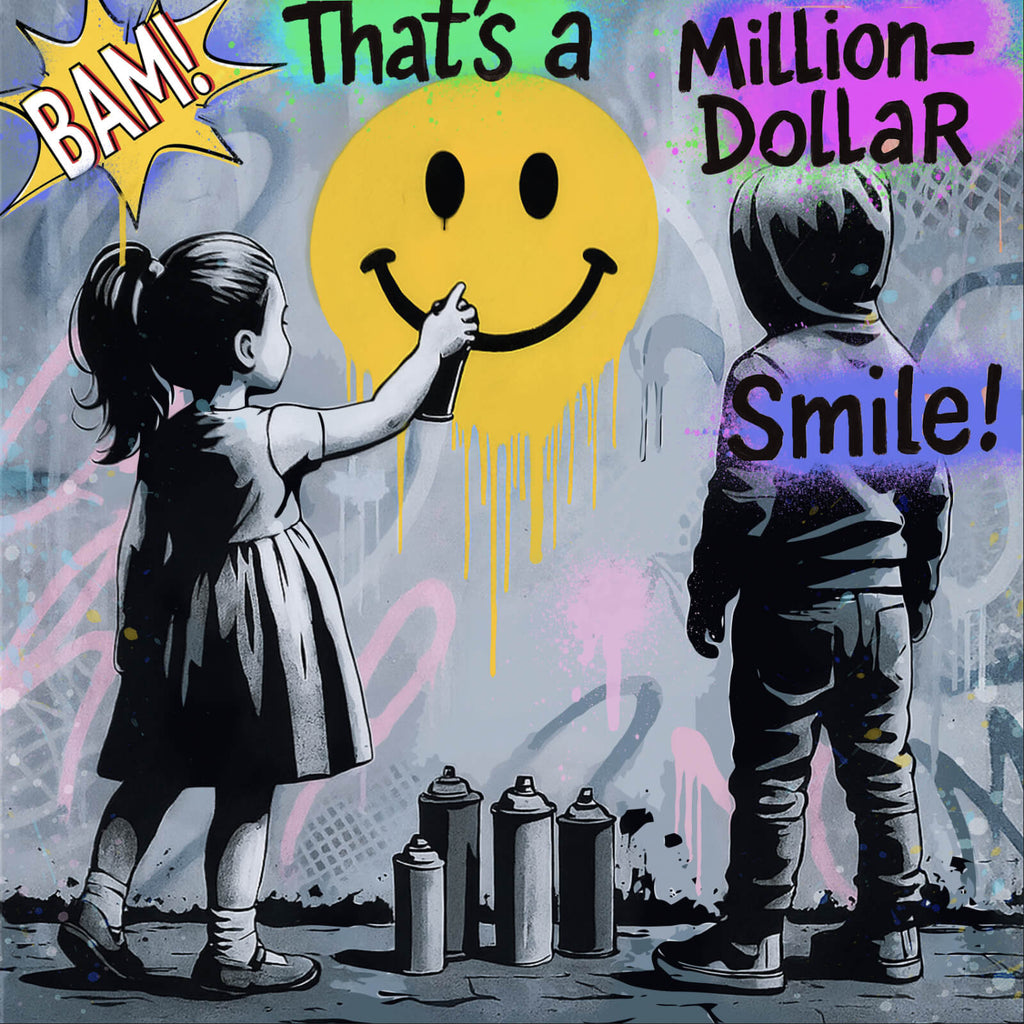 Das Bild zeigt zwei Kinder in einer urbanen Umgebung, die vor einer Wand stehen, auf der ein großes, gelbes Smiley-Gesicht gesprüht ist. Das Smiley ist leuchtend gelb und verleiht der grauen, strukturierten Wand einen lebhaften Kontrast. Das Gesicht ist mit dicken, schwarzen Linien gezeichnet, die Augen und den Mund bilden. Die linke Seite des Bildes zeigt ein Mädchen in einem Kleid, das eine Sprühdose hält und anscheinend gerade das Smiley fertiggestellt hat. Ihr Gesichtsausdruck ist nicht sichtbar, aber ihre Haltung deutet auf Zufriedenheit und Stolz hin. Rechts steht ein Junge in einer Kapuzenjacke, der das Kunstwerk bewundert. Um die Kinder herum sind mehrere Farbspritzereien in Rosa, Blau und Grün zu sehen, die dem Bild eine dynamische und lebendige Atmosphäre verleihen. Oberhalb des Smiley sind die Worte "That's a Million-Dollar Smile!" in bunten Buchstaben geschrieben, was das positive und humorvolle Thema des Bildes unterstreicht. Die Szene ist eine Mischung aus Street Art und kindlicher Unschuld, die Kreativität und Freude an der Kunst feiert.