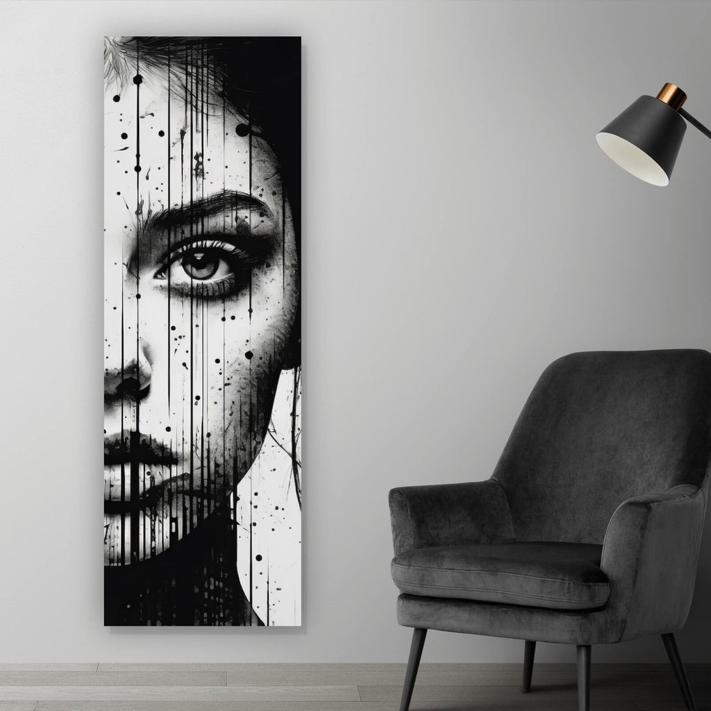 Dieses Wandbild präsentiert ein modernes, abstraktes Porträt, das durch seine ausdrucksstarken Linien und Tropfen besticht. Die Darstellung eines Gesichts wird durch eine kreative Kombination von Formen und Tropfen zum Leben erweckt, die eine dynamische und zugleich mystische Atmosphäre erzeugen. Die kunstvolle Anordnung der Elemente verleiht dem Bild eine tiefe Ausdrucksstärke und eine faszinierende Wirkung, die jeden Raum aufwertet. Der Stil des Bildes ist zeitgenössisch und spricht Liebhaber moderner Kunst an, die Wert auf Ästhetik und Design legen. Die Komposition aus klaren Linien und spontanen Tropfen verleiht dem Porträt eine lebendige Dynamik, während die dezente Farbgebung für Eleganz sorgt. Als Wandbild ist es ideal für Wohnzimmer, Büros oder Schlafzimmer geeignet, wo es als stilvolles Dekorationselement fungiert und gleichzeitig inspirierend wirkt. Die künstlerische Umsetzung des Motivs schafft eine Verbindung zwischen traditioneller Porträtkunst und moderner Abstraktion, was dieses Kunstwerk zu einem einzigartigen Hingucker macht. Ob als zentrales Element einer Galerie oder als einzelner Blickfang, dieses Bild fügt sich nahtlos in unterschiedliche Einrichtungsstile ein und zieht bewundernde Blicke auf sich.