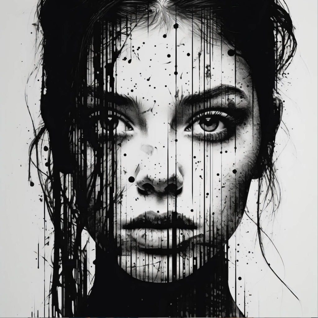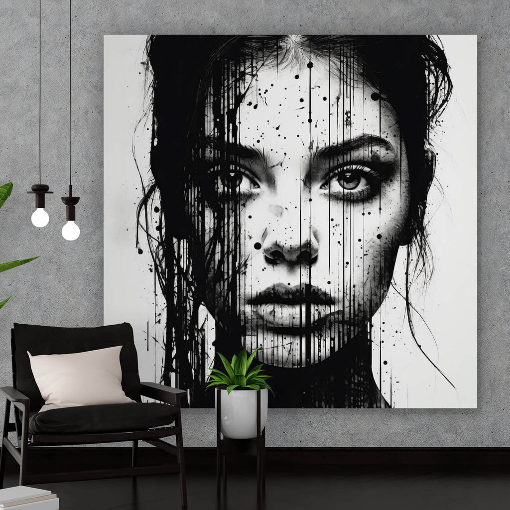 Dieses Wandbild präsentiert ein modernes, abstraktes Porträt, das durch seine ausdrucksstarken Linien und Tropfen besticht. Die Darstellung eines Gesichts wird durch eine kreative Kombination von Formen und Tropfen zum Leben erweckt, die eine dynamische und zugleich mystische Atmosphäre erzeugen. Die kunstvolle Anordnung der Elemente verleiht dem Bild eine tiefe Ausdrucksstärke und eine faszinierende Wirkung, die jeden Raum aufwertet. Der Stil des Bildes ist zeitgenössisch und spricht Liebhaber moderner Kunst an, die Wert auf Ästhetik und Design legen. Die Komposition aus klaren Linien und spontanen Tropfen verleiht dem Porträt eine lebendige Dynamik, während die dezente Farbgebung für Eleganz sorgt. Als Wandbild ist es ideal für Wohnzimmer, Büros oder Schlafzimmer geeignet, wo es als stilvolles Dekorationselement fungiert und gleichzeitig inspirierend wirkt. Die künstlerische Umsetzung des Motivs schafft eine Verbindung zwischen traditioneller Porträtkunst und moderner Abstraktion, was dieses Kunstwerk zu einem einzigartigen Hingucker macht. Ob als zentrales Element einer Galerie oder als einzelner Blickfang, dieses Bild fügt sich nahtlos in unterschiedliche Einrichtungsstile ein und zieht bewundernde Blicke auf sich.