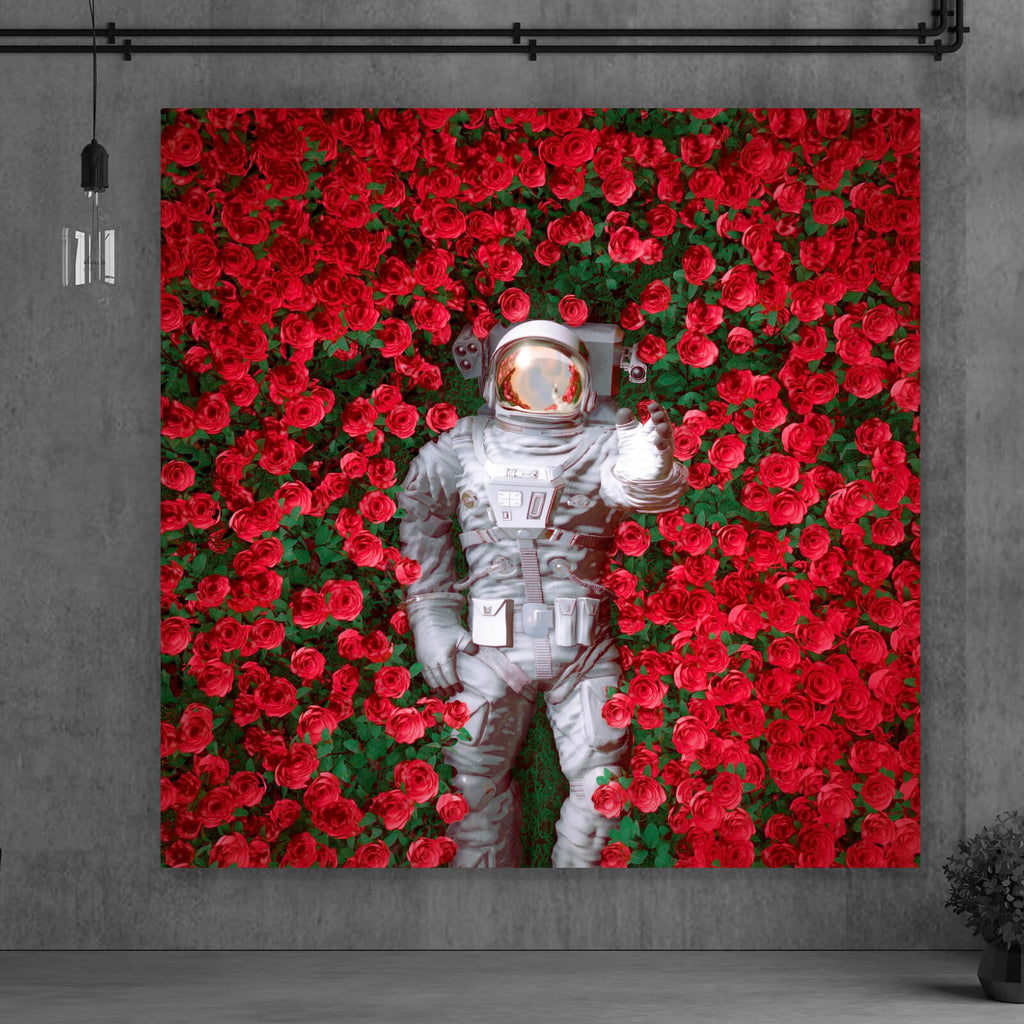 Das Wandbild zeigt einen faszinierenden Kontrast zwischen einem Astronauten in voller Montur und einem üppigen Meer aus Rosen. Diese ungewöhnliche Kombination erzeugt eine surreale und beeindruckende Atmosphäre, die sowohl den Betrachter zum Träumen einlädt als auch zum Nachdenken anregt. Der Astronaut, dessen Anzug mit feinen Details und präzisen Linien verziert ist, wirkt, als wäre er aus einer futuristischen Vision entsprungen. Die Rosen um ihn herum verleihen dem Bild eine weiche, romantische Note und schaffen eine harmonische Balance zwischen Technik und Natur. Diese Verschmelzung von unterschiedlichen Elementen erzeugt eine moderne Kunstform, die sowohl dynamisch als auch beruhigend wirkt. Die Tiefe des Bildes wird durch die geschickte Anordnung der Rosen und die Position des Astronauten verstärkt, wodurch ein dreidimensionaler Effekt entsteht. Das Bild eignet sich hervorragend als dekorativer Akzent in verschiedenen Räumen wie Wohnzimmer oder Büro, da es Gespräche anregt und eine inspirierende Stimmung verbreitet. Die Materialanmutung des Wandbildes deutet auf eine hochwertige Verarbeitung hin, was es zu einem langlebigen und stilvollen Dekorationsstück macht. Die künstlerische Darstellung der Verbindung von Mensch und Natur in einem kosmischen Kontext macht dieses Bild zu einem einzigartigen Blickfang.