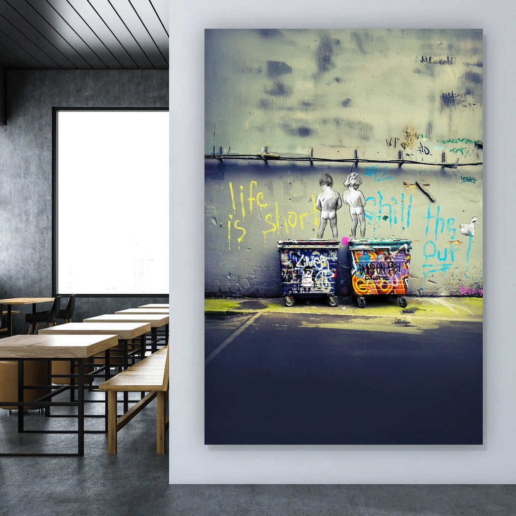 Auf der Suche nach einem ausgefallenen Wandbild als Aluminiumbild gebürstet? Das Motiv Banksy - Life is short im Hochformat gefällt dir und du hast nach Wandbildern mit den Wörtern Banksy, Life, Short, Chill, Duck, Out, Container, Graffiti und Street Art gesucht? Dann ist dieses Aluminiumbild gebürstet in der Farbe Bunt genau das richtige Wandbild und Dekorelement für dich! Setze ein Highlight an deiner Wand! Das Aluminiumbild gebürstet Banksy - Life is short ist in 4 verschiedenen Größen verfügbar, von klein und dezent bis hin zum XXL Aluminiumbild gebürstet.