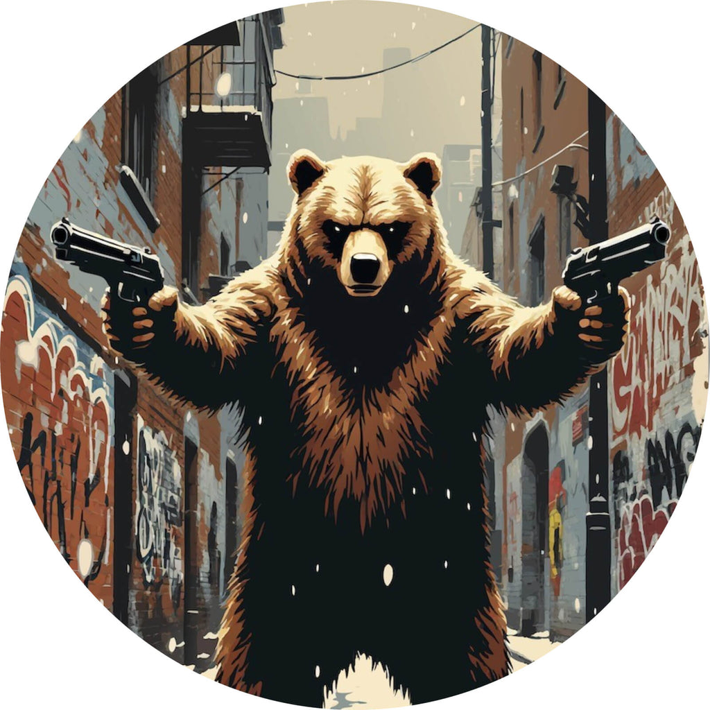 Das Bild zeigt eine surreale und humorvolle Szene, in der ein großer Bär in einer engen, schneebedeckten Stadtgasse steht. Der Bär hat eine beeindruckende Präsenz und hält in jeder seiner Tatzen eine Pistole, was der Szene eine unerwartete und bedrohliche Note verleiht. Die Gasse ist von hohen Ziegelwänden flankiert, die mit lebhaften Graffitis bedeckt sind, was auf eine urbane Umgebung hindeutet. Der Boden ist mit einer dünnen Schneeschicht bedeckt, und vereinzelte Schneeflocken fallen sanft vom Himmel, was die winterliche Atmosphäre verstärkt. Im Hintergrund sind Feuerleitern und Stromleitungen zu sehen, die das typische Stadtbild einer engen Gasse vervollständigen. Die Farbpalette des Bildes wird von Brauntönen dominiert, die das Fell des Bären charakterisieren, während Grautöne und Rottöne die Wände und die Umgebung definieren. Die Szene ist künstlerisch gestaltet und kombiniert Realität mit einer Prise Fantasie, was beim Betrachter Neugier und ein Schmunzeln hervorruft.