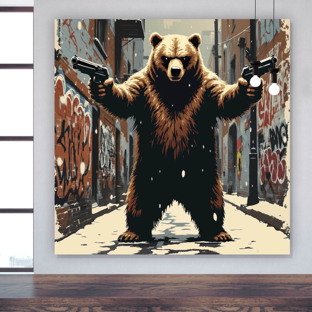 Das Bild zeigt eine surreale und humorvolle Szene, in der ein großer Bär in einer engen, schneebedeckten Stadtgasse steht. Der Bär hat eine beeindruckende Präsenz und hält in jeder seiner Tatzen eine Pistole, was der Szene eine unerwartete und bedrohliche Note verleiht. Die Gasse ist von hohen Ziegelwänden flankiert, die mit lebhaften Graffitis bedeckt sind, was auf eine urbane Umgebung hindeutet. Der Boden ist mit einer dünnen Schneeschicht bedeckt, und vereinzelte Schneeflocken fallen sanft vom Himmel, was die winterliche Atmosphäre verstärkt. Im Hintergrund sind Feuerleitern und Stromleitungen zu sehen, die das typische Stadtbild einer engen Gasse vervollständigen. Die Farbpalette des Bildes wird von Brauntönen dominiert, die das Fell des Bären charakterisieren, während Grautöne und Rottöne die Wände und die Umgebung definieren. Die Szene ist künstlerisch gestaltet und kombiniert Realität mit einer Prise Fantasie, was beim Betrachter Neugier und ein Schmunzeln hervorruft.