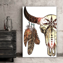 • Lade das Bild in den Galerie-Viewer, Aluminiumbild gebürstet Büffelschädel mit Federn Hochformat