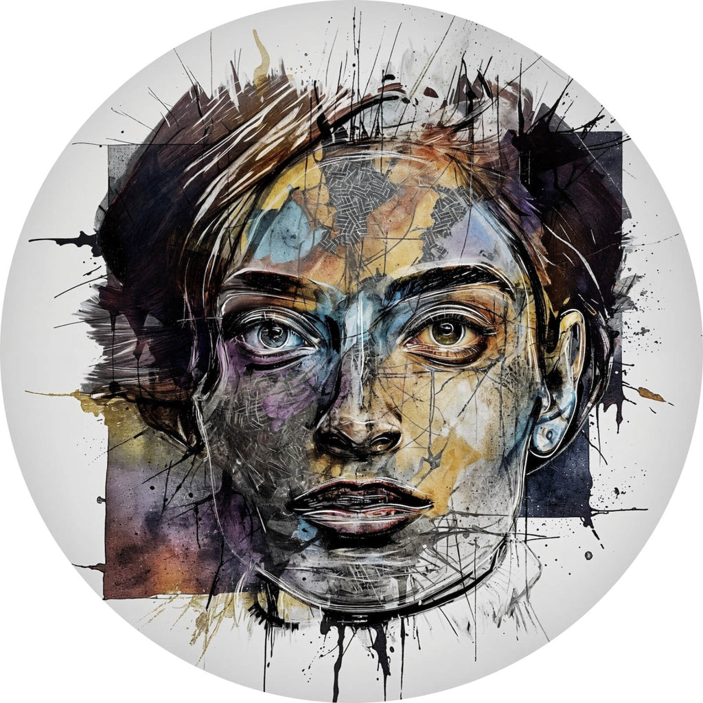 Das gebürstete Aluminiumbild Bunte Gesichtskunst Modern Art als Kreis hat eine matte Oberfläche und wird direkt auf eine 3 mm starke gebürstete Aluminium Verbundplatte digital gedruckt. Wandbilder im Edelstahl Look wirken besonders edel, da die gebürstete, metallisch anmutende Oberfläche hindurchscheint. Bei weißen und hellen Stellen kommt dieser metallische Effekt noch besser zur Geltung, da Weiß nicht gedruckt wird und das charakteristische Aluminium somit komplett sichtbar ist. Unsere Aluminiumbilder haben einen Kern aus schwarzem Polyethylen, der von beiden Seiten mit einer 0,3 mm starken Aluminiumschicht überzogen und matt gebürstet ist. Gegenüber Material aus reinem Aluminium verfügen unsere Aluminiumplatten über ein deutlich geringeres Gewicht, was die Montage stark vereinfacht. Wandbilder im Alu Look sind wasserfest und auch für den Außenbereich geeignet. Gebürstete Aluminiumbilder, die auch nach Jahren noch wie neu aussehen und strahlen.