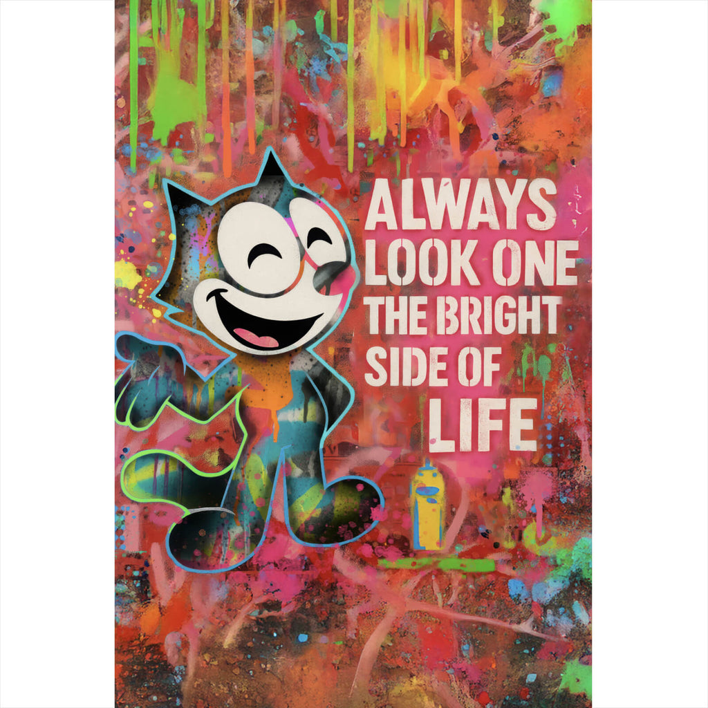 Das Bild zeigt eine fröhliche Cartoon-Katze, die lebhaft vor einem Hintergrund aus Graffiti und bunten Farben steht. Die Katze ist in einem dynamischen Stil dargestellt, umgeben von einer Vielzahl von kräftigen Farben wie Orange, Pink, Blau und Grün, die für eine lebendige und energiegeladene Atmosphäre sorgen. Links von der Katze befindet sich das inspirierende Zitat „ALWAYS LOOK ON THE BRIGHT SIDE OF LIFE“, das in großen, weißen Buchstaben geschrieben ist. Der Hintergrund besteht aus einer Vielzahl von Farbspritzern und Tropfen, die wild und künstlerisch über die Oberfläche verteilt sind, was dem Bild eine moderne, urbane Ästhetik verleiht. Rechts unten ist eine gelbe Sprühdose zu sehen, die auf die Entstehung der Graffiti hinweist und den kreativen Schaffensprozess unterstreicht. Insgesamt vermittelt das Bild eine positive und lebensbejahende Botschaft, die durch die bunte und lebhafte Darstellung ergänzt wird. Es lädt den Betrachter ein, das Leben aus einer optimistischen Perspektive zu betrachten und die Farben und Freuden des Alltags zu schätzen