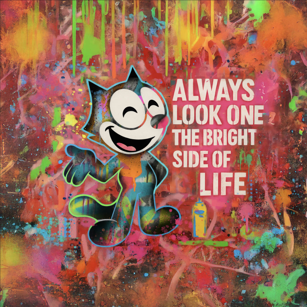 Das Bild zeigt eine fröhliche Cartoon-Katze, die lebhaft vor einem Hintergrund aus Graffiti und bunten Farben steht. Die Katze ist in einem dynamischen Stil dargestellt, umgeben von einer Vielzahl von kräftigen Farben wie Orange, Pink, Blau und Grün, die für eine lebendige und energiegeladene Atmosphäre sorgen. Links von der Katze befindet sich das inspirierende Zitat „ALWAYS LOOK ON THE BRIGHT SIDE OF LIFE“, das in großen, weißen Buchstaben geschrieben ist. Der Hintergrund besteht aus einer Vielzahl von Farbspritzern und Tropfen, die wild und künstlerisch über die Oberfläche verteilt sind, was dem Bild eine moderne, urbane Ästhetik verleiht. Rechts unten ist eine gelbe Sprühdose zu sehen, die auf die Entstehung der Graffiti hinweist und den kreativen Schaffensprozess unterstreicht. Insgesamt vermittelt das Bild eine positive und lebensbejahende Botschaft, die durch die bunte und lebhafte Darstellung ergänzt wird. Es lädt den Betrachter ein, das Leben aus einer optimistischen Perspektive zu betrachten und die Farben und Freuden des Alltags zu schätzen
