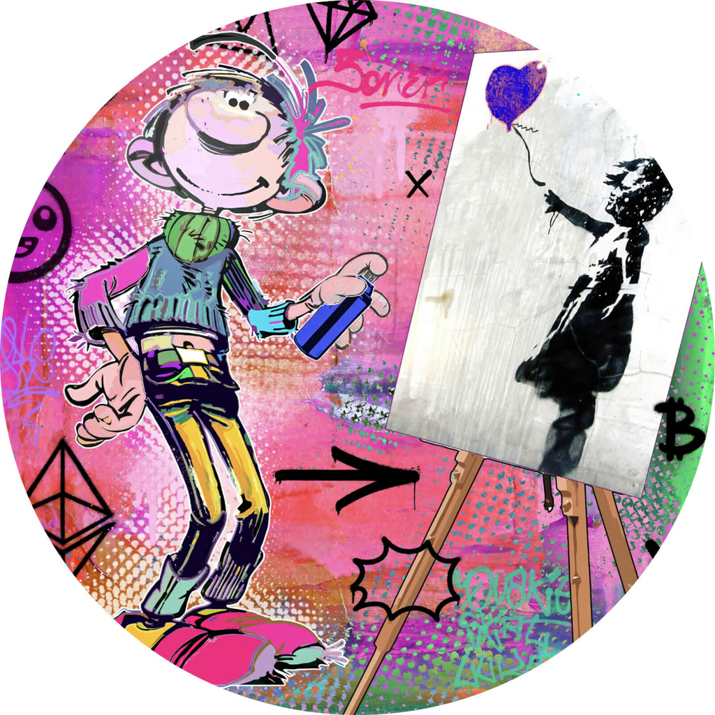 Das Bild zeigt eine lebendige und dynamische Szene in einem urbanen Kunststil. Im Zentrum steht eine Comic-ähnliche Figur, die fröhlich und bunt gekleidet ist. Die Figur hält eine Spraydose in der Hand, was auf eine Verbindung zur Graffiti- oder Street-Art-Kultur hinweist. Die Kleidung der Figur besteht aus einem grün-blauen Pullover und gelb-blauen Hosen, was den verspielten und kreativen Charakter unterstreicht. Links von der Figur ist eine Leinwand auf einem Holzständer zu sehen, auf der ein ikonisches Bild eines Mädchens mit einem Herzballon abgebildet ist. Dieses Bild erinnert an bekannte Street-Art-Werke und verleiht dem gesamten Werk eine tiefere Bedeutungsebene. Der Hintergrund ist eine Explosion aus Farben, vorwiegend Pink, Blau und Grün, mit verschiedenen grafischen Elementen wie Herzen, Pfeilen und geometrischen Formen, die das Bild zusätzlich beleben. Diese Elemente erzeugen eine dynamische und fesselnde Atmosphäre, die den Betrachter in eine Welt voller Kreativität und künstlerischer Freiheit eintauchen lässt. Der Stil des Bildes ist eine Mischung aus Pop-Art und Comic-Kunst, die mit modernen urbanen Elementen kombiniert wird, um ein einzigartiges visuelles Erlebnis zu schaffen.