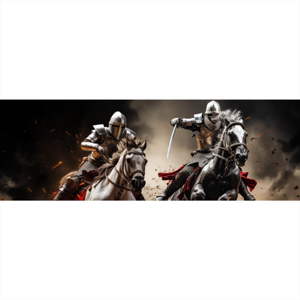 Dieses beeindruckende Wandbild zeigt zwei Ritter in voller Rüstung, die auf kraftvollen Pferden inmitten einer dynamischen und spannungsgeladenen Szene reiten. Die Darstellung fängt die Essenz eines mittelalterlichen Kampfes ein, wobei die Reiter mit entschlossener Miene und gezogenen Waffen aufeinander zujagen. Die Bewegung der Pferde ist eindrucksvoll eingefangen, der aufgewirbelte Staub verleiht dem Bild eine zusätzliche dynamische Tiefe und verstärkt das Gefühl von Geschwindigkeit und Intensität. Die Rüstungen der Ritter glänzen im Licht, was einen starken Kontrast zur rauen Umgebung bildet. Dieses kunstvolle Werk fesselt den Betrachter durch seine lebendige Darstellung von Stärke und Tradition. Der epische Charakter der Szene wird durch die dramatische Komposition unterstrichen, die sowohl Spannung als auch historische Authentizität vermittelt. Ideal für Räume, die eine Atmosphäre von Abenteuer und Energie ausstrahlen sollen, zieht dieses Bild alle Blicke auf sich und verleiht jedem Raum eine eindrucksvolle Präsenz. Die Balance zwischen den kraftvollen Formen und der feinen Detailgenauigkeit macht es zu einem perfekten Gesprächsstück und einem Muss für Liebhaber von historischen und dramatischen Kunstwerken.