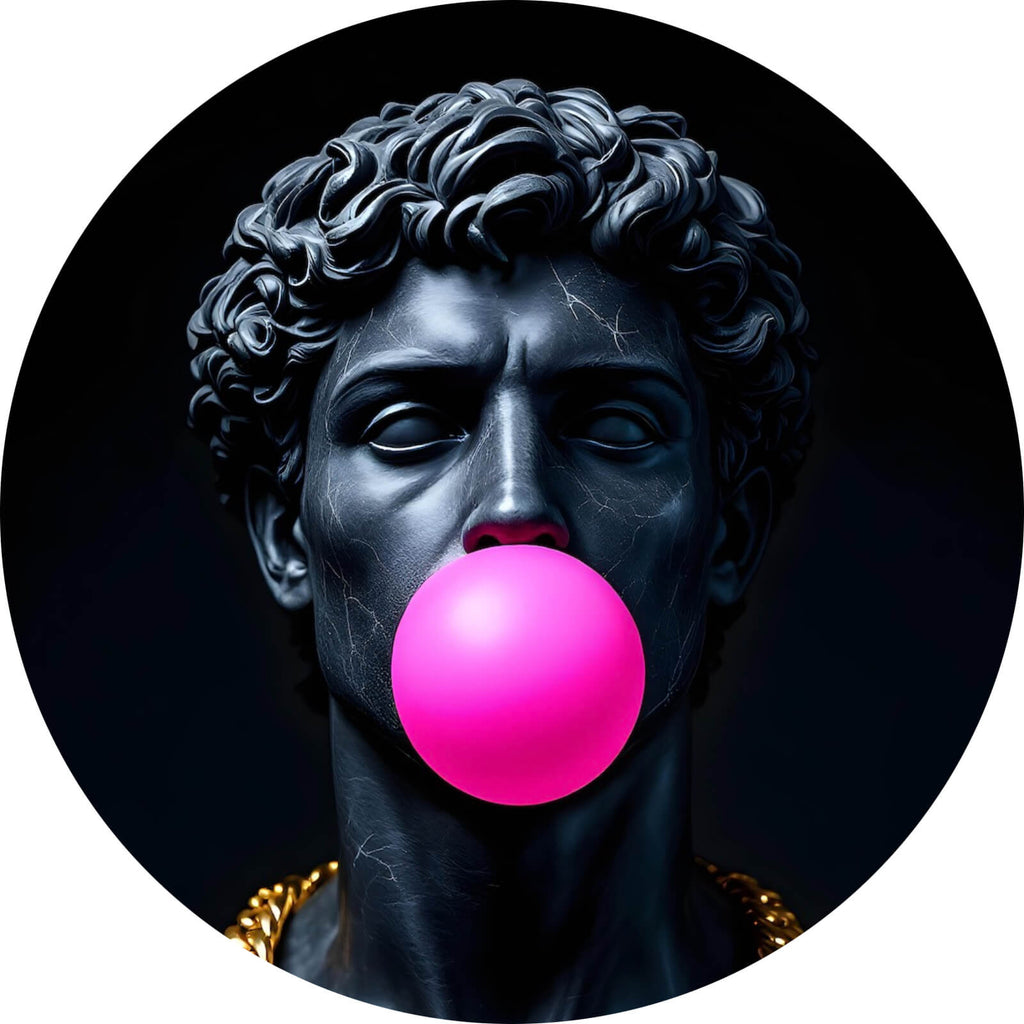 Dieses eindrucksvolle Wandbild zeigt einen edlen Skulpturenkopf, der durch einen modernen Pop-Art-Stil besticht. Der Fokus liegt auf einem markanten Kaugummi, das dem klassischen Motiv eine unerwartete, spielerische Note verleiht. Die Kombination aus traditioneller Skulptur und zeitgenössischem Element schafft eine faszinierende Spannung, die sowohl stilvoll als auch provokant wirkt. Der Skulpturenkopf ist detailliert gearbeitet, mit ausgeprägten Gesichtszügen und kunstvollen Locken, die dem Bild Tiefe und Charakter verleihen. Der massive, glänzende Schmuck um den Hals der Figur betont die luxuriöse Ästhetik und verstärkt den Eindruck von Eleganz und Reichtum. Das Bild vermittelt eine starke Präsenz und eignet sich hervorragend als zentrales Dekorationselement in modernen Wohnräumen oder Büros. Die Mischung aus klassischem und modernem Stil macht es zu einem Blickfang, der Diskussionen anregt und künstlerischen Ausdruck mit zeitgenössischer Coolness verbindet. Dieses Kunstwerk eignet sich perfekt für alle, die eine Vorliebe für außergewöhnliche und charakterstarke Dekoration haben.