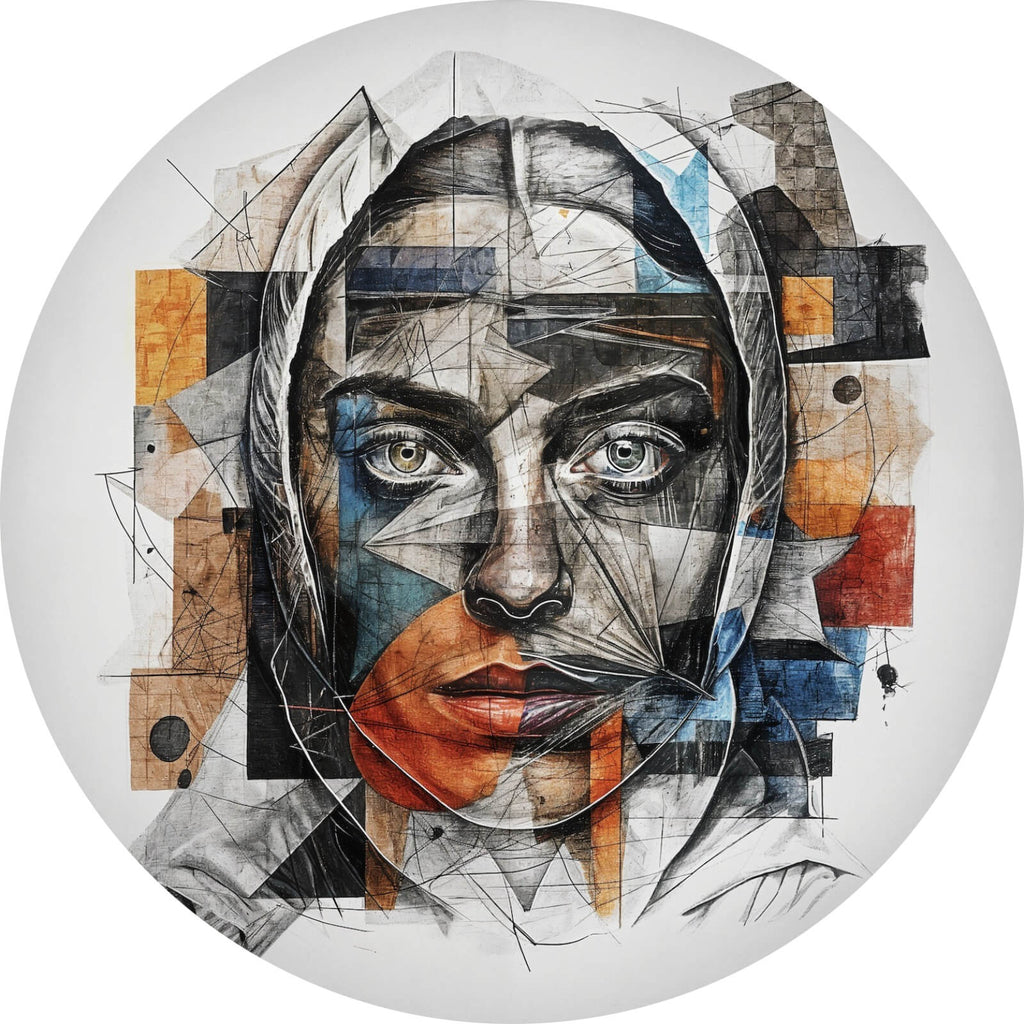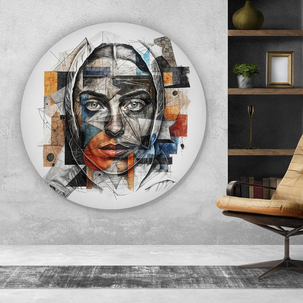 Dieses eindrucksvolle Wandbild zeigt ein abstraktes Porträt, das durch seine moderne, kreative Gestaltung sofort ins Auge fällt. Das Gesicht, kunstvoll aus geometrischen Formen zusammengesetzt, kombiniert verschiedene Stilelemente, die eine faszinierende Tiefe und Komplexität erzeugen. Die Linien und Formen des Bildes schaffen eine dynamische Struktur, die den Blick des Betrachters fesselt und die Aufmerksamkeit auf die fein detaillierten Gesichtszüge lenkt. Diese Kunstwerk wirkt sowohl kraftvoll als auch mysteriös und verleiht jedem Raum eine stilvolle, anspruchsvolle Atmosphäre. Es eignet sich hervorragend für moderne Wohnräume, Büros oder Praxen, in denen es als Blickfang dient und gleichzeitig eine inspirierende Umgebung schafft. Die Komposition zeigt eine harmonische Balance zwischen abstrakter Kunst und realistischer Darstellung, was dem Bild einen einzigartigen Charakter verleiht. Die Anmutung des Materials vermittelt einen Hauch von Raffinesse und Eleganz, während die unterschiedlichen Formen und Linien im Bild eine lebendige Energie ausstrahlen. Ein perfektes Beispiel für die Verschmelzung von Kreativität und Kunst, das sowohl Kunstliebhaber als auch Designenthusiasten anspricht und inspiriert.