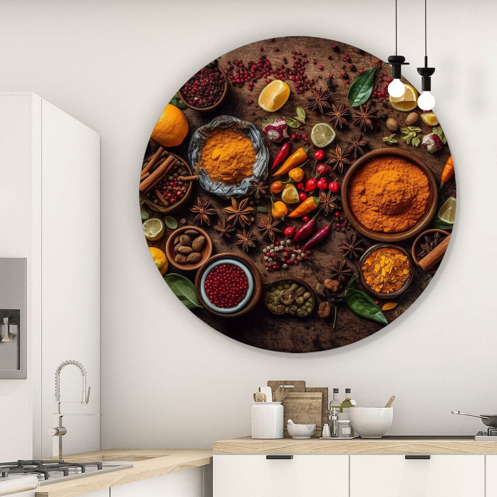 Aluminiumbild gebürstet Exotische Gewürze auf rustikalem Holztisch Kreis