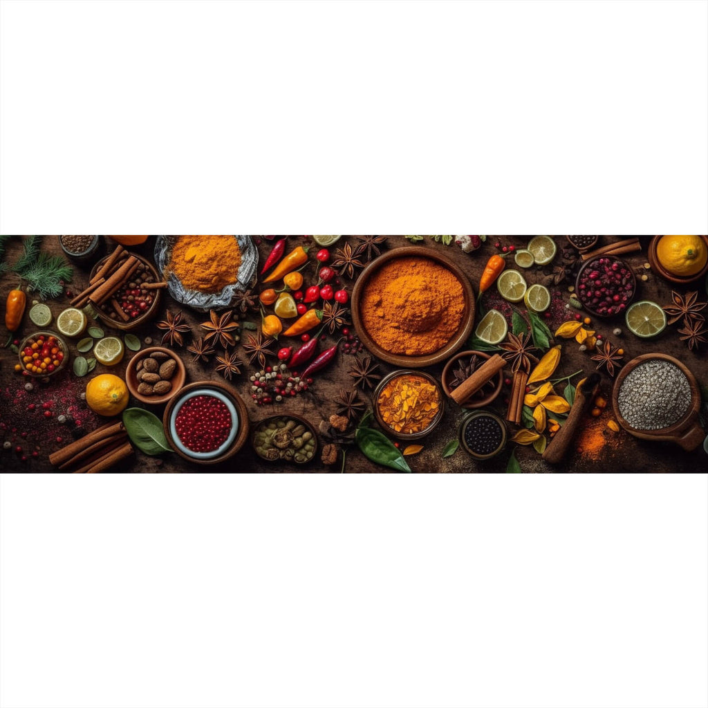 Dieses beeindruckende Wandbild zeigt eine Vielzahl exotischer Gewürze kunstvoll arrangiert auf einem rustikalen Holztisch. Die Komposition aus verschiedenen Formen und Texturen verleiht dem Bild eine lebendige und einladende Atmosphäre. Das Bild fängt die Essenz von kulinarischer Vielfalt und kreativer Gestaltung ein, indem es eine Vielzahl von Gewürzen und Zutaten darstellt, die in harmonischem Einklang miteinander stehen. Die Anordnung der Elemente und die natürliche Materialanmutung des Holztisches schaffen eine warme und einladende Stimmung, die ideal für Küchen, Esszimmer oder gastronomische Einrichtungen geeignet ist. Die Detailgenauigkeit der verschiedenen Gewürze und deren Präsentation lassen den Betrachter in eine Welt voller Aromen und Geschmacksnoten eintauchen, was dem Raum Tiefe und Charakter verleiht. Dieses Kunstwerk ist mehr als nur eine Dekoration; es ist eine Einladung, die Sinne zu beleben und die Schönheit der Natur in den Alltag zu integrieren. Die Kombination aus traditionellem und modernem Stil macht dieses Bild zu einem perfekten Akzent für jedes Interieur, das sowohl Ästhetik als auch Funktionalität vereint.