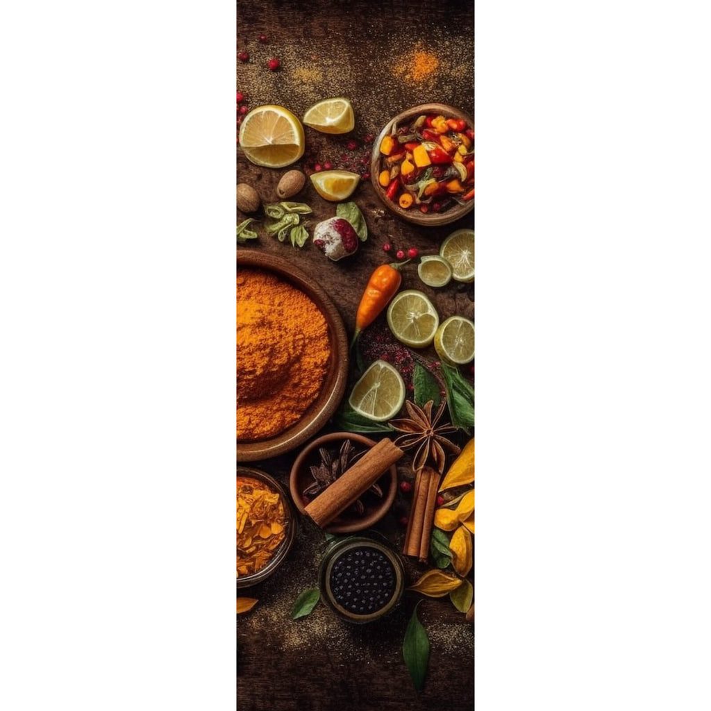 Dieses beeindruckende Wandbild zeigt eine Vielzahl exotischer Gewürze kunstvoll arrangiert auf einem rustikalen Holztisch. Die Komposition aus verschiedenen Formen und Texturen verleiht dem Bild eine lebendige und einladende Atmosphäre. Das Bild fängt die Essenz von kulinarischer Vielfalt und kreativer Gestaltung ein, indem es eine Vielzahl von Gewürzen und Zutaten darstellt, die in harmonischem Einklang miteinander stehen. Die Anordnung der Elemente und die natürliche Materialanmutung des Holztisches schaffen eine warme und einladende Stimmung, die ideal für Küchen, Esszimmer oder gastronomische Einrichtungen geeignet ist. Die Detailgenauigkeit der verschiedenen Gewürze und deren Präsentation lassen den Betrachter in eine Welt voller Aromen und Geschmacksnoten eintauchen, was dem Raum Tiefe und Charakter verleiht. Dieses Kunstwerk ist mehr als nur eine Dekoration; es ist eine Einladung, die Sinne zu beleben und die Schönheit der Natur in den Alltag zu integrieren. Die Kombination aus traditionellem und modernem Stil macht dieses Bild zu einem perfekten Akzent für jedes Interieur, das sowohl Ästhetik als auch Funktionalität vereint.