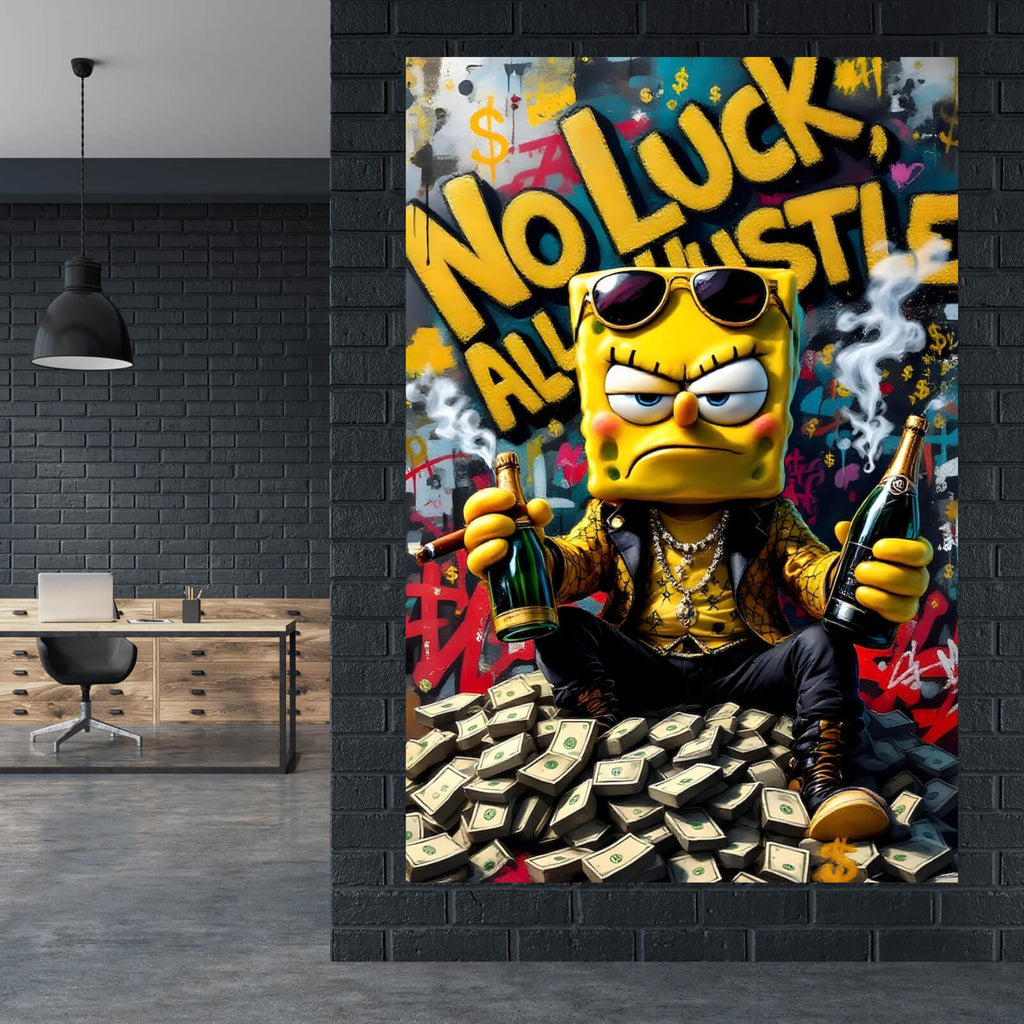 Dieses Wandbild zeigt eine markante Cartoon-Figur, die ein eindrucksvolles Statement abgibt. Die Figur sitzt lässig auf einem großen Stapel Geld und hält in jeder Hand eine Flasche, was den Aspekt von Luxus und Erfolg unterstreicht. Hinter der Figur ist ein dynamischer Hintergrund mit dem Spruch „No Luck, All Hustle“ zu sehen, der Entschlossenheit und die Bedeutung harter Arbeit betont. Der Stil des Bildes ist stark von Pop Art und urbaner Kunst beeinflusst, was eine moderne und trendbewusste Ausstrahlung erzeugt. Die Kombination aus klaren Linien und verspielten Elementen verleiht dem Bild eine kreative und einzigartige Note. Die Darstellung vermittelt ein Gefühl von Selbstbewusstsein und Individualität, ideal für Räume, die Persönlichkeit und Stil ausdrücken sollen. Dieses Kunstwerk ist ein echter Hingucker und eignet sich perfekt als dekoratives Element in Wohnzimmern, Büros oder Bars, wo es Gespräche anregen und die Umgebung aufwerten kann. Es ist nicht nur ein Bild, sondern auch ein Ausdruck von Lifestyle und moderner Kunst, der jedem Raum eine besondere Atmosphäre verleiht.