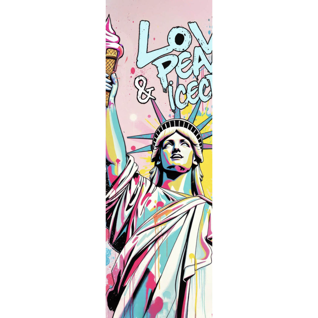 Das Bild zeigt eine kreative und moderne Interpretation der Freiheitsstatue, die in einem lebhaften Pop-Art-Stil dargestellt ist. Die Statue hält anstelle der traditionellen Fackel ein Eis in der Hand, was dem Kunstwerk eine humorvolle und unkonventionelle Note verleiht. Umgeben von lebhaften Farbspritzern in Pink, Blau und Gelb, vermittelt das Bild eine fröhliche und dynamische Atmosphäre. Hinter der Statue sind die Wörter "Love, Peace & Icecream" in großen, verspielten Buchstaben zu sehen, die das Thema des Bildes verstärken. Diese Kombination aus ikonischem Symbol und moderner Kunstform spricht ein urbanes und junges Publikum an, das nach Ausdruck und Individualität strebt. Die Verwendung von Graffiti-Elementen verleiht dem Bild eine zusätzliche Tiefe und verbindet traditionelle Symbole mit zeitgenössischer Kunst. Diese Darstellung könnte in einer urbanen Galerie oder als Streetart in einer Großstadt wie New York zu finden sein und spiegelt die kulturelle Vielfalt und den kreativen Geist der modernen Kunstszene wider.