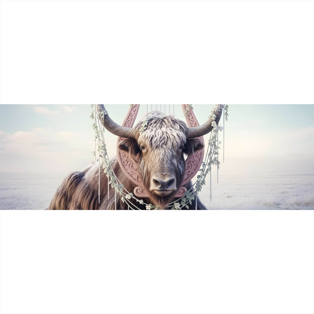 Dieses beeindruckende Wandbild zeigt ein majestätisches Hochlandrind, das in einer surrealen und doch harmonischen Komposition mit einer dekorativen Harfe dargestellt wird. Die Harfe, kunstvoll mit floralen Elementen verziert, umrahmt den Kopf des Rindes und verleiht dem Bild eine einzigartige künstlerische Note. Das Motiv strahlt Ruhe und Gelassenheit aus, während die sanften Kurven und detaillierten Strukturen der Harfe die Eleganz des Tieres unterstreichen. Diese Kombination von Natur und Kunst schafft eine tiefgreifende Symbolik, die sowohl traditionell als auch modern wirkt. Das Bild eignet sich hervorragend als dekoratives Element in Wohnräumen oder Büros, wo es als Inspiration und Gesprächsstoff dienen kann. Die kunstvolle Darstellung des Tieres in Verbindung mit der Harfe vermittelt eine Atmosphäre von Anmut und Kreativität, die den Betrachter in eine Welt der Fantasie und Ästhetik entführt. Die detaillierte Ausarbeitung und die harmonische Verbindung von Tier und Kunstobjekt machen dieses Wandbild zu einem wahren Kunstwerk, das sowohl für Naturliebhaber als auch für Kunstenthusiasten von großem Interesse ist.