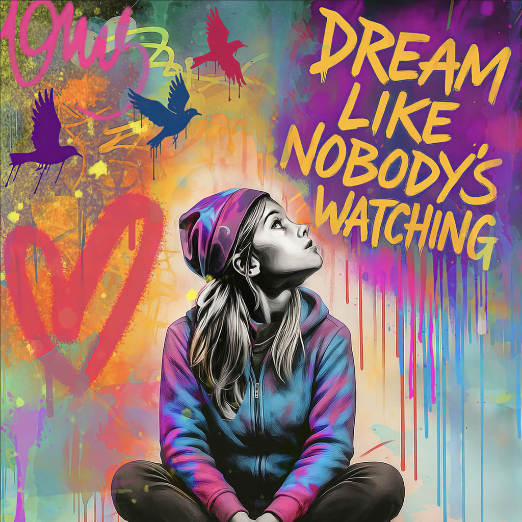 Auf dem Bild ist eine junge Frau zu sehen, die lässig auf einem Podest sitzt. Sie trägt einen farbenfrohen Hoodie und eine Mütze, die ihr Gesicht umrahmen. Ihre Beine sind verschränkt, und sie trägt schwarze Sneakers mit weißen Schnürsenkeln. Der Hintergrund ist lebendig und voller Farben, mit Spritzern und Graffiti-Elementen, die eine urbane Atmosphäre schaffen. Mehrere Vögel sind in verschiedenen Farben fliegend dargestellt, und ein großes, rotes Herz ist prominent zu sehen. Der Schriftzug „Dream Like Nobody’s Watching“ in gelber Farbe hebt sich deutlich ab und vermittelt eine inspirierende Botschaft. Die Mischung aus Farben, Formen und dem nachdenklichen Gesichtsausdruck der jungen Frau erzeugt ein Gefühl von Freiheit und Kreativität. Das Bild vermittelt eine positive, motivierende Energie, die dazu ermutigt, seine Träume zu verfolgen, ohne sich von äußeren Einflüssen ablenken zu lassen. Es spiegelt den Geist der Jugend und die Kraft der Vorstellung wider, während es gleichzeitig die urbane Kunstszene feiert.