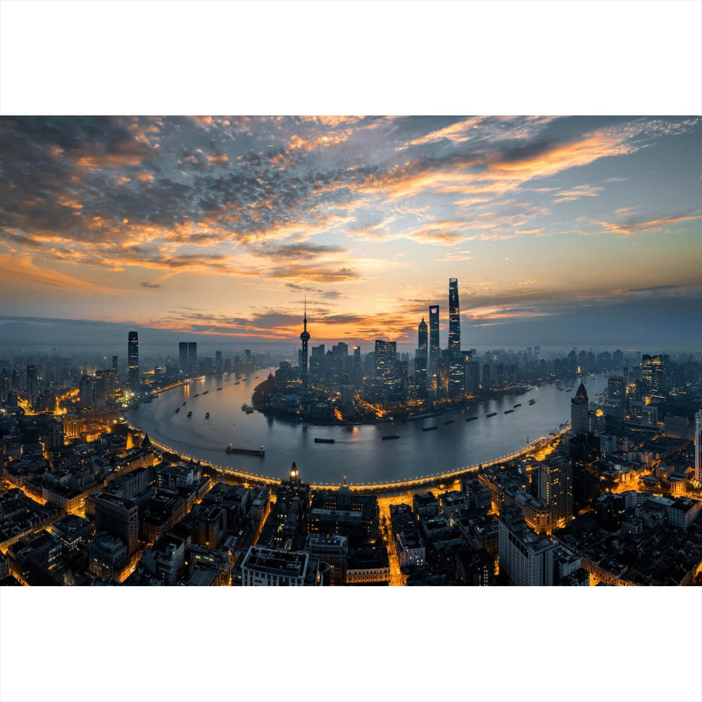 Das Bild zeigt eine beeindruckende moderne Stadtlandschaft, die durch ihre imposante Skyline und das weite Panorama besticht. Die dynamische Anordnung der Hochhäuser und Wolkenkratzer schafft eine beeindruckende Silhouette am Horizont. Diese städtische Metropole präsentiert sich in voller Pracht, wobei die Beleuchtung der Gebäude bei Dämmerung ein faszinierendes Spiel von Licht und Schatten erzeugt. Die Perspektive aus der Vogelperspektive verleiht dem Betrachter das Gefühl, über die Stadt zu schweben, und eröffnet eine umfassende Aussicht auf die urbane Dynamik. Der Fluss, der sich durch die Stadt schlängelt, fügt eine natürliche Komponente hinzu und betont die harmonische Verbindung von Natur und Architektur. Die Konturen der Stadt zeichnen sich klar gegen den Horizont ab, unterstrichen von der subtilen Beleuchtung, die die architektonischen Details hervorhebt. Diese Darstellung einer modernen Metropole ist ideal für Liebhaber von Urbanität und Architektur, die die Energie und das Leben der Stadt in ihren Wohn- oder Arbeitsräumen integrieren möchten. Das Bild vermittelt eine Stimmung von Fortschritt und Innovation, während es gleichzeitig eine beruhigende Atmosphäre durch die weite Perspektive und die harmonische Anordnung der Elemente schafft.