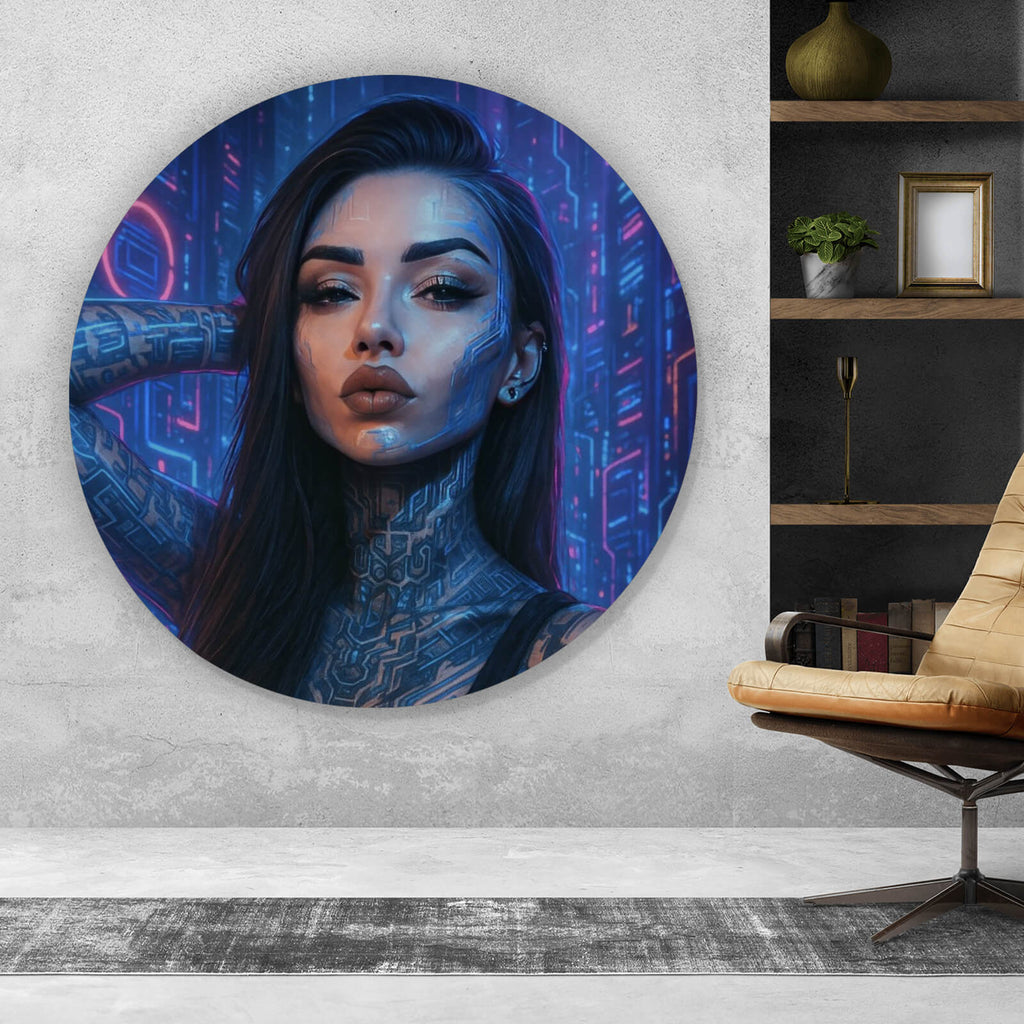 Auf der Suche nach einem ausgefallenen Wandbild als Aluminiumbild gebürstet? Das Motiv Katjahlix Cyberpunk-Frau mit leuchtenden Tattoos und futuristischem Hintergrund als Kreis gefällt dir und du hast nach Wandbildern mit den Wörtern Katjahlix, Cyberpunk, Frau, Tattoos, Futuristisch, Neon, Technologie, Sci-Fi, Leuchten, Nacht, Hintergrund, Portrait, Kunst, Digital, Stil, Moderne, Mysteriös, Intensiv, Nachtleben, Urban und Innovation gesucht? Dann ist dieses Aluminiumbild gebürstet in den Farben Blau, Lila und Pink genau das richtige Wandbild und Dekorelement für dich! Setze ein Highlight an deiner Wand! Das Aluminiumbild gebürstet Katjahlix Cyberpunk-Frau mit leuchtenden Tattoos und futuristischem Hintergrund ist in 5 verschiedenen Größen verfügbar, von klein und dezent bis hin zum XXL Aluminiumbild gebürstet.