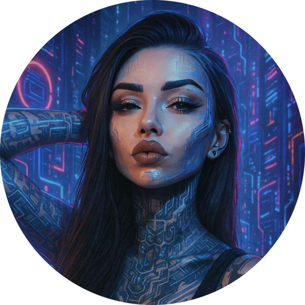 Das Bild zeigt eine Frau in einem faszinierenden Cyberpunk-Stil. Ihre Haut ist mit leuchtenden, blauen und violetten Tattoos bedeckt, die wie digitale Schaltkreise aussehen und im Kontrast zu ihrem dunklen Haar stehen. Sie trägt ein schwarzes, ärmelloses Oberteil, das die detaillierten Muster auf ihren Armen und ihrem Hals sichtbar macht. Ihr Gesichtsausdruck ist ernst und geheimnisvoll, was durch die dramatische Beleuchtung noch verstärkt wird. Der Hintergrund des Bildes ist ein urbanes, futuristisches Stadtbild, das in Neonfarben erstrahlt. Die dominierenden Farben sind Blau, Pink und Lila, die der Szene eine lebendige und zugleich mystische Atmosphäre verleihen. Die leuchtenden Linien und Formen im Hintergrund erinnern an die digitale Welt und unterstreichen das Thema von Technologie und Zukunft. Dieses Bild verkörpert den Geist des Cyberpunk-Genres, indem es Elemente von Technologie, Individualität und urbaner Kultur kombiniert. Die starke visuelle Wirkung wird durch die kontrastreiche Farbpalette und die künstlerischen Details verstärkt, die den Betrachter in eine andere, futuristische Welt entführen.