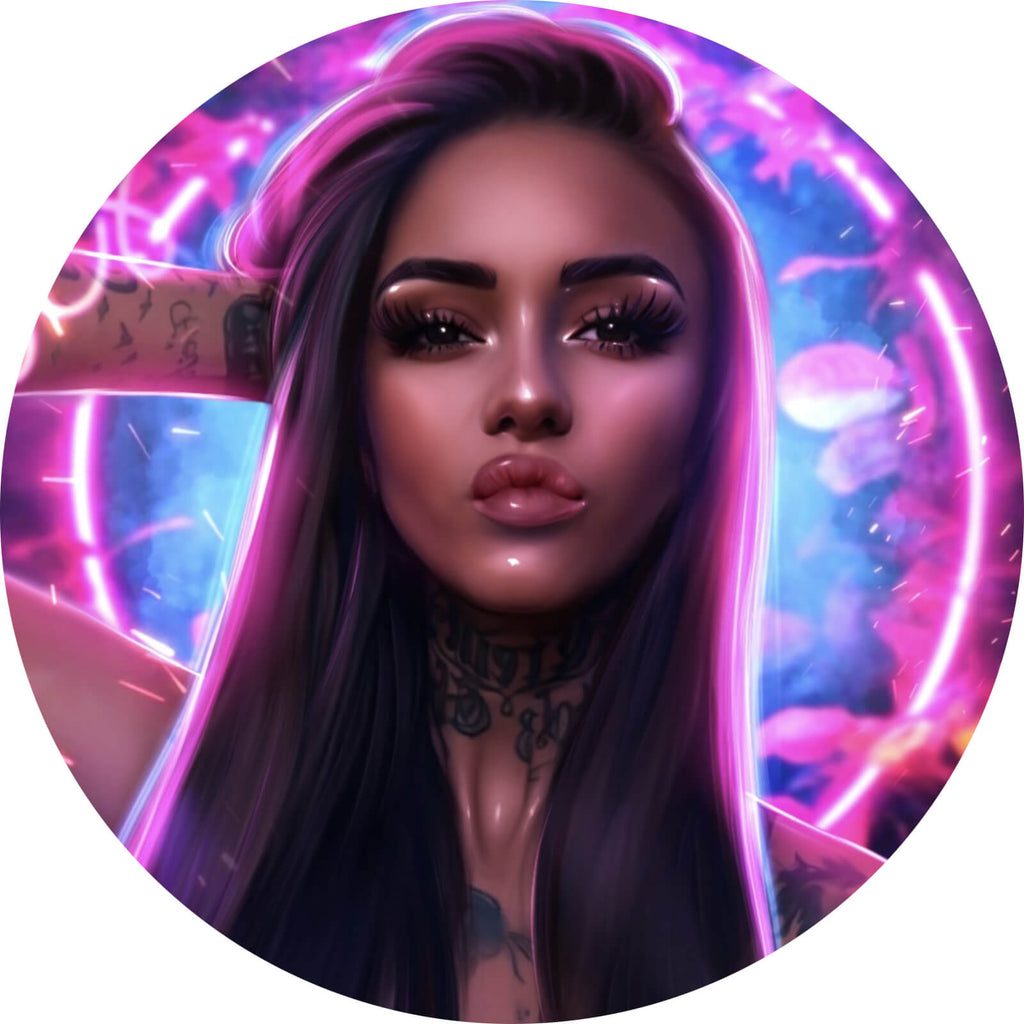 Das Bild zeigt eine stilisierte, digitale Darstellung einer Frau, die von intensiven Neonfarben umgeben ist. Sie hat lange, dunkle Haare, die sanft über ihre Schultern fallen. Ihr Gesicht ist ausdrucksstark und von einem leichten Glanz überzogen, was ihre makellose Haut betont. Sie trägt ein schwarzes, transparentes Oberteil, das ihren modernen und selbstbewussten Stil unterstreicht. Auffällig sind die detaillierten Tattoos, die ihren Hals und ihre Schulter schmücken, und ihr ein rebellisches, künstlerisches Aussehen verleihen. Der Hintergrund ist ein faszinierendes Spiel aus leuchtenden Pink- und Blautönen, die eine Art Lichtkreis bilden, der die Silhouette der Frau hervorhebt. Diese Farbkombination erzeugt eine dynamische und energiegeladene Atmosphäre, die das Bild lebendig und futuristisch wirken lässt. Die gesamte Komposition strahlt eine Aura von Glamour und Intensität aus, die den Betrachter in den Bann zieht und die künstlerische Kreativität feiert, die in der digitalen Kunst möglich ist.