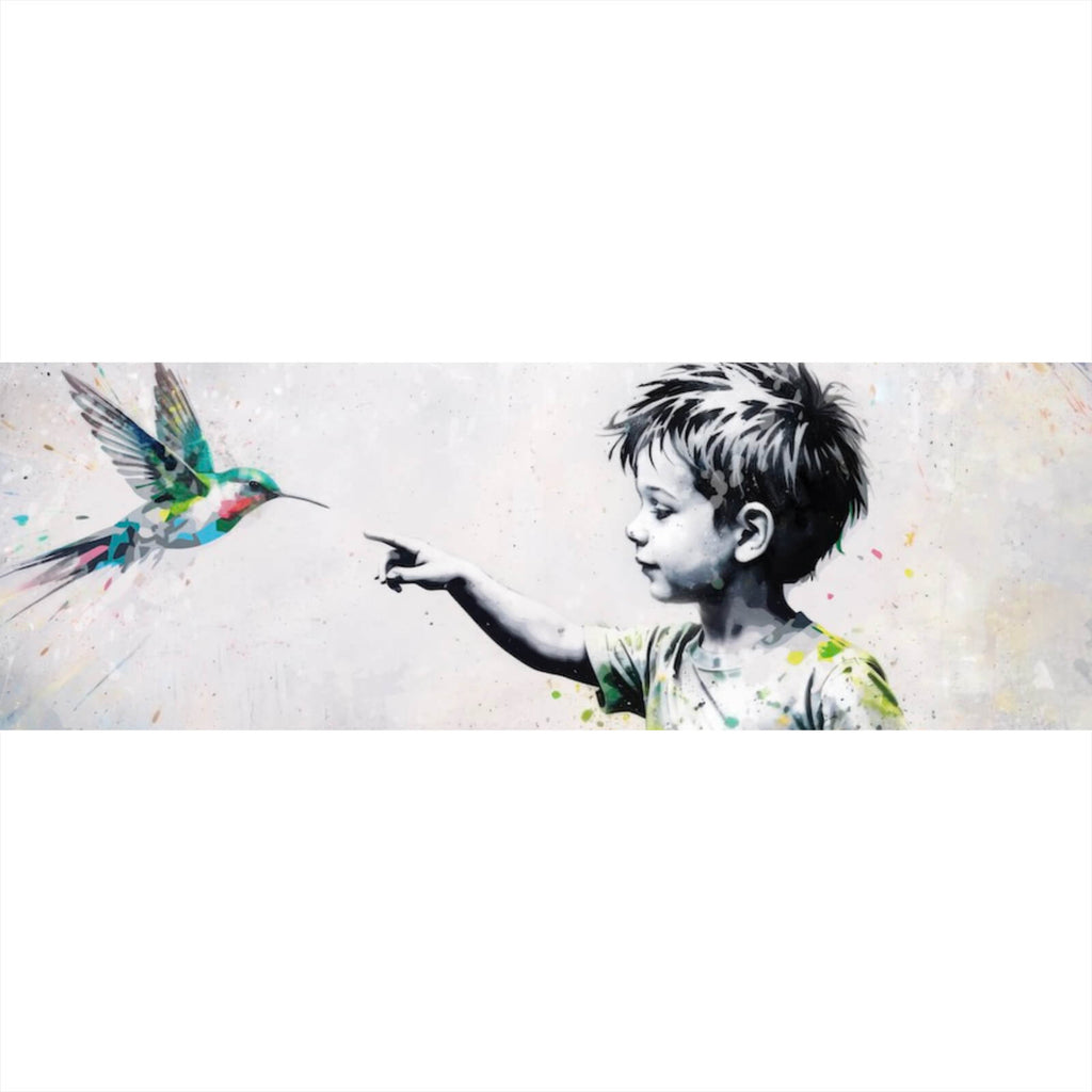 Auf der Suche nach einem ausgefallenen Wandbild als Aluminiumbild gebürstet? Das Motiv Kind berührt Vögel im Panorama gefällt dir und du hast nach Wandbildern mit den Wörtern Kind, Kindheit, Kolibri, Vögel, Anziehung, Kreativ, Atmosphäre, Inspiration, Dynamik, Ausdruck, Lebhaft und Pop Art gesucht? Dann ist dieses Aluminiumbild gebürstet in der Farbe Bunt genau das richtige Wandbild und Dekorelement für dich! Setze ein Highlight an deiner Wand! Das Aluminiumbild gebürstet Kind berührt Vögel ist in 3 verschiedenen Größen verfügbar, von klein und dezent bis hin zum XXL Aluminiumbild gebürstet.