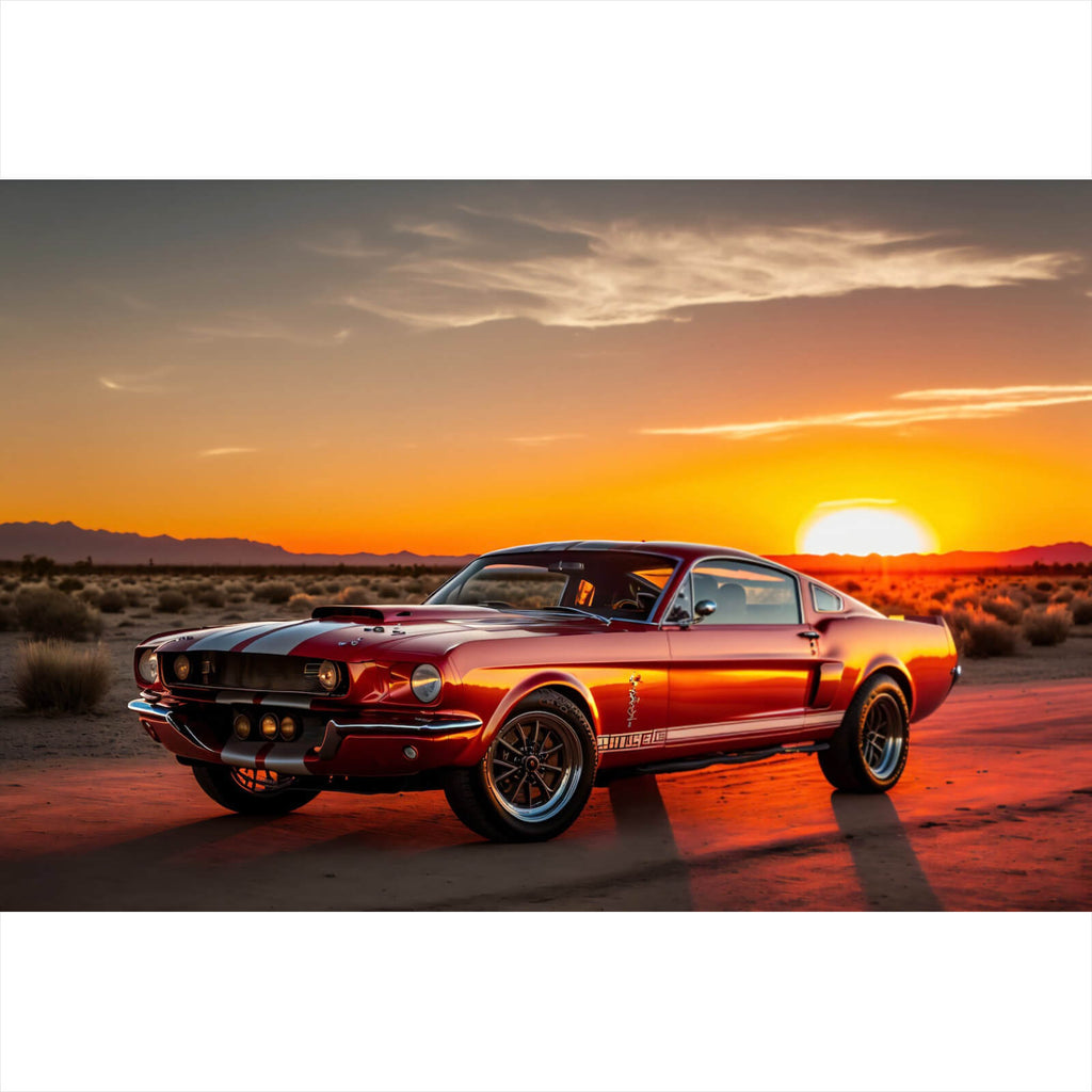 Das Bild zeigt ein klassisches Auto, das in einer beeindruckenden Wüstenlandschaft bei Sonnenuntergang steht. Der Oldtimer strahlt Eleganz und Retro-Charme aus, während die sanften Konturen und glänzenden Oberflächen des Fahrzeugs ein Gefühl von Zeitlosigkeit vermitteln. Die offene Umgebung der Wüste verstärkt das Gefühl von Freiheit und Abenteuer, während der Sonnenuntergang dem Bild eine warme und beruhigende Atmosphäre verleiht. Die Kombination aus natürlicher Landschaft und der technischen Raffinesse des klassischen Autos schafft eine harmonische Komposition, die sowohl für Auto-Enthusiasten als auch für Liebhaber von Landschaftsfotografie ansprechend ist. Dieses Bild eignet sich perfekt als dekoratives Element in verschiedenen Räumen, da es sowohl ein Gefühl von Stil als auch von Ruhe vermittelt. Die Detailgenauigkeit und die sorgfältige Inszenierung des Autos im Zusammenspiel mit der natürlichen Umgebung machen dieses Wandbild zu einem echten Hingucker. Es lädt den Betrachter ein, sich auf eine imaginäre Reise zu begeben und die Schönheit und Faszination klassischer Fahrzeuge in einer einzigartigen Kulisse zu erleben.