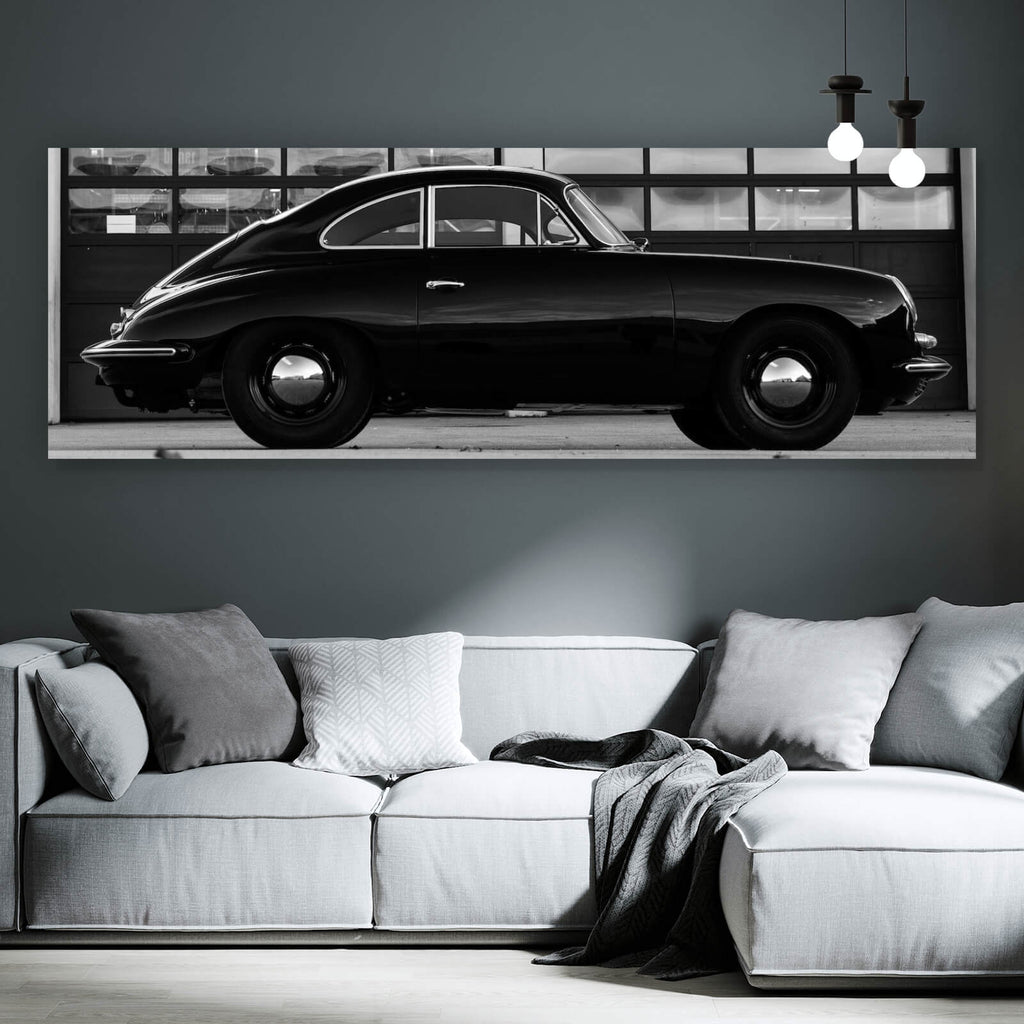 Diese beeindruckende Fotografie zeigt ein klassisches Auto in einer eleganten Seitenansicht vor einem stilvollen Werkstattgebäude. Das Bild vermittelt ein Gefühl von Nostalgie und zeitlosem Design, das Automobil-Enthusiasten und Liebhaber von Vintage-Ästhetik gleichermaßen anspricht. Die klaren Linien des Fahrzeugs stehen im perfekten Kontrast zu der strukturierten Fassade der Werkstatt, welche mit großen Fenstern und geometrischen Formen besticht. Diese Komposition erzeugt eine harmonische Balance zwischen Technik und Architektur, wobei das Fahrzeug mit seiner ikonischen Form und detaillierten Verarbeitung im Mittelpunkt steht. Die Szene strahlt eine ruhige, aber kraftvolle Präsenz aus, die die Eleganz und den Stil vergangener Zeiten einfängt. Der minimalistische Hintergrund lenkt die Aufmerksamkeit auf das Auto selbst, während die Umgebung subtile Hinweise auf die mechanische Präzision und das historische Erbe des Fahrzeugs gibt. Diese Darstellung ist ideal für Räume, die eine Atmosphäre von Raffinesse und klassischem Charme ausstrahlen sollen, und eignet sich hervorragend als dekoratives Element in Garagen, Werkstätten oder Büros, wo sie Bewunderer des klassischen Automobildesigns inspirieren kann.