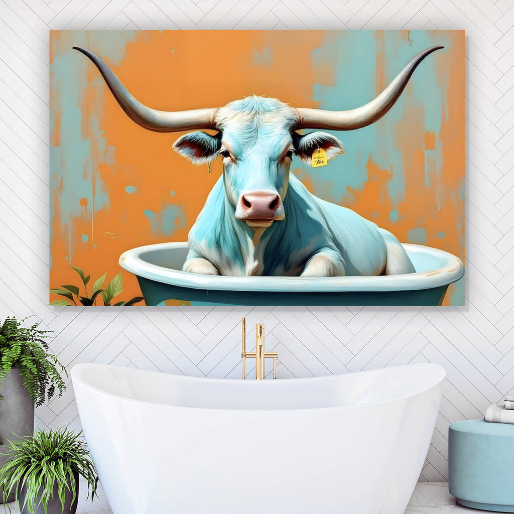 Dieses beeindruckende Wandbild zeigt eine humorvolle und kreative Darstellung einer Kuh, die in einer Badewanne sitzt. Das Motiv vereint Elemente von Modern Art und Pop Art, wodurch es zu einem einzigartigen Highlight in jedem Raum wird. Die Kuh, mit ihren majestätischen Hörnern, sitzt entspannt und vermittelt eine skurrile, aber zugleich stilvolle Atmosphäre. Diese kreative Komposition strahlt eine spielerische und entspannte Stimmung aus, die perfekt für moderne und trendbewusste Einrichtungen geeignet ist. Die Badewanne im Bild verstärkt den Eindruck von Humor und Unbeschwertheit, während der Hintergrund einen kunstvollen Kontrast bietet, der die Szene lebendig macht. Das Wandbild eignet sich ideal für Räume, die einen Hauch von Kreativität und Humor benötigen, wie Wohnzimmer, Büro oder Badezimmer. Die Kombination aus Tiermotiv und Badewanne macht dieses Bild zu einem echten Hingucker, der Gesprächsstoff bietet und jedem Raum eine besondere Note verleiht. Die hochwertige Ausführung und das originelle Motiv sorgen dafür, dass dieses Wandbild nicht nur dekorativ, sondern auch inspirierend wirkt. Ob als stilvolle Dekoration oder als Ausdruck persönlichen Geschmacks, dieses Bild ist ein Muss für Liebhaber moderner und ungewöhnlicher Kunst.