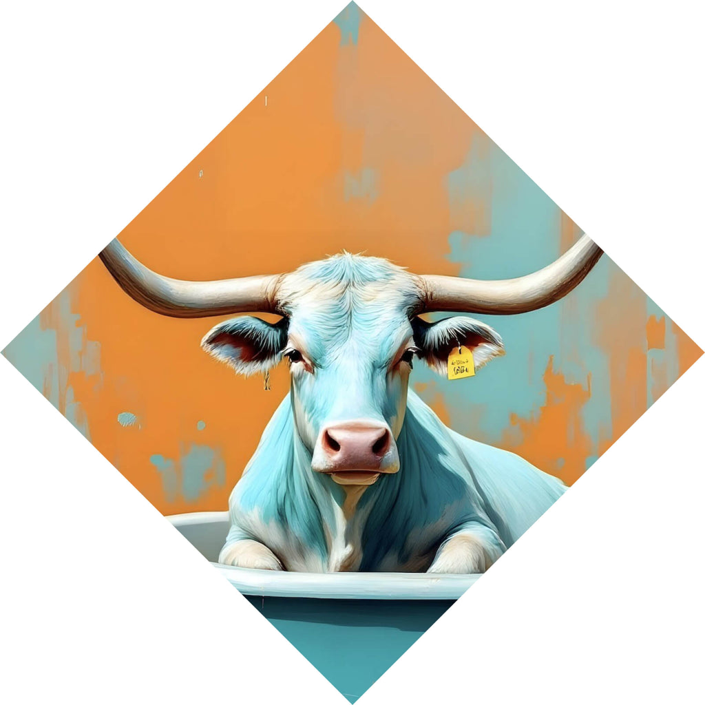 Auf der Suche nach einem ausgefallenen Wandbild als Aluminiumbild gebürstet? Das Motiv Kuh mit langen Hörnern in Badewanne als Raute gefällt dir und du hast nach Wandbildern mit den Wörtern Kuh, Hörner, Tier, Badewanne, Humor, Entspannung, Lifestyle und Witz gesucht? Dann ist dieses Aluminiumbild gebürstet in den Farben Blau, Orange und Weiß genau das richtige Wandbild und Dekorelement für dich! Setze ein Highlight an deiner Wand! Das Aluminiumbild gebürstet Kuh mit langen Hörnern in Badewanne ist in 4 verschiedenen Größen verfügbar, von klein und dezent bis hin zum XXL Aluminiumbild gebürstet.