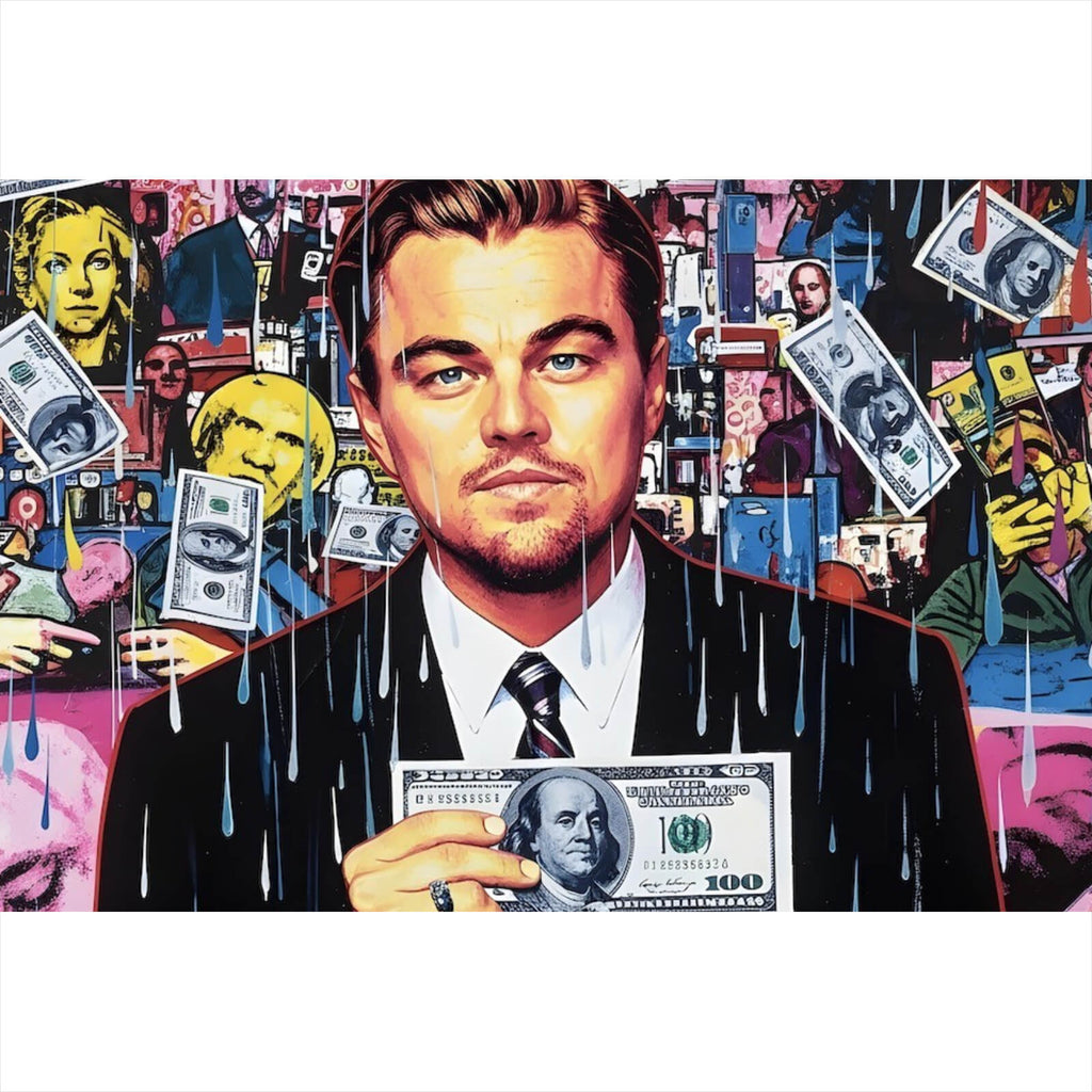 Das Bild zeigt einen Mann in einem schwarzen Anzug mit Krawatte, der einen 100-Dollar-Schein in den Händen hält. Der Hintergrund ist eine lebendige Collage aus verschiedenen Pop-Art-Elementen und Bildern, die in kräftigen Farben wie Blau, Rot und Gelb gestaltet sind. Über dem gesamten Bild scheinen Dollar-Scheine in unterschiedlichen Ausrichtungen und Größen herabzufallen, was einen dynamischen und fast surrealen Effekt erzeugt. Der Mann wirkt konzentriert und selbstbewusst, als würde er die Bedeutung des Geldes und dessen Einfluss symbolisieren. Die verschiedenen Gesichter und Figuren im Hintergrund könnten auf unterschiedliche Persönlichkeiten oder historische Figuren hinweisen, die einen Einfluss auf den gesellschaftlichen oder wirtschaftlichen Kontext haben. Die Tropfen, die über das Bild verteilt sind, verleihen dem Kunstwerk eine zusätzliche Dimension, die an Regen erinnern könnte, was möglicherweise eine Metapher für den unaufhörlichen Fluss von Geld und Macht darstellt. Insgesamt vermittelt das Bild eine starke visuelle Botschaft über Reichtum, Konsum und den Einfluss von Geld in der modernen Welt, alles verpackt in einem auffälligen, künstlerischen Stil.