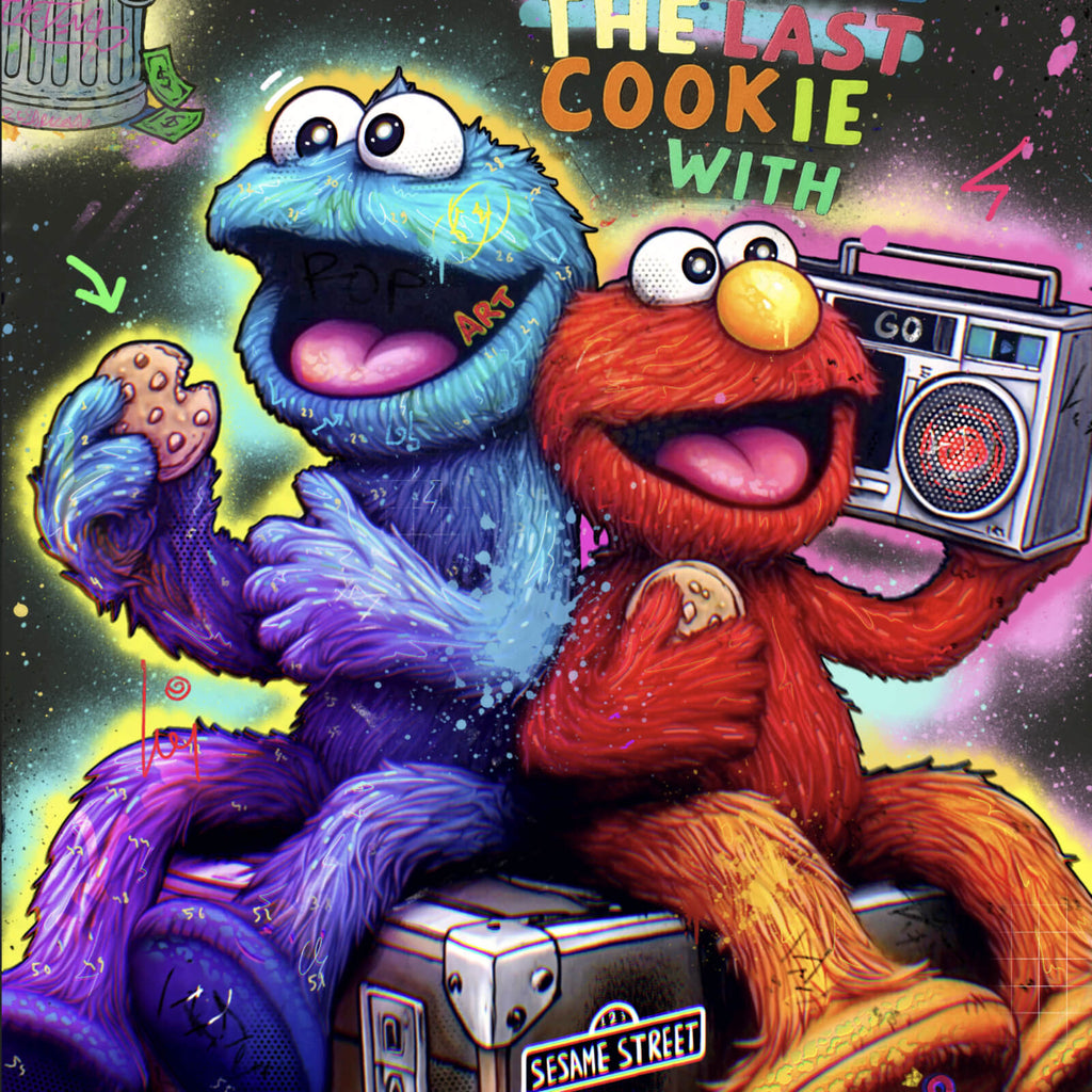 Das Bild zeigt eine lebendige, farbenfrohe Illustration, die zwei ikonische Figuren darstellt. Der blaue Charakter hält einen Keks in der Hand und hat ein fröhliches Lächeln im Gesicht. Neben ihm sitzt der rote Charakter, der ebenfalls einen Keks genießt und ein großes, altes Radio hält. Beide Figuren sitzen auf einer Kiste, die mit der Aufschrift "Sesame Street" versehen ist. Diese Szene strahlt eine warme, fröhliche Atmosphäre aus und vermittelt ein Gefühl von Gemeinschaft und Freundschaft. Im Hintergrund ist ein grüner Charakter zu sehen, der aus einem Mülleimer hervorlugt, um die Szene zu beobachten. Die Umgebung ist mit leuchtenden Farben und Spritzern gestaltet, was dem Ganzen einen dynamischen, pop-artigen Stil verleiht. Der Schriftzug „A friend is someone to share the last cookie with“ ergänzt die Szene perfekt, indem er die Bedeutung der Freundschaft unterstreicht. Die Mischung aus Graffiti-Elementen und leuchtenden Farben gibt dem Bild eine einzigartige, kreative Note, die sowohl Kinder als auch Erwachsene anspricht.