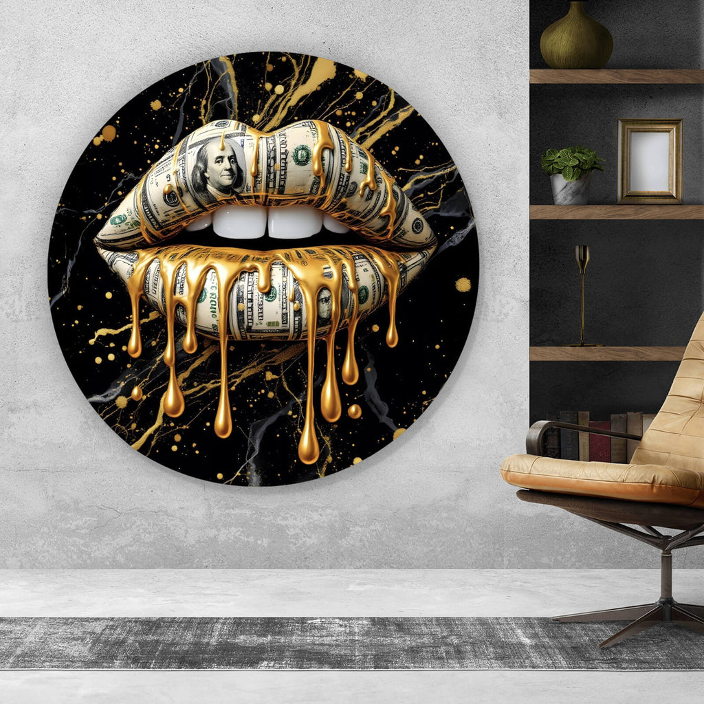 Auf der Suche nach einem ausgefallenen Wandbild als Aluminiumbild gebürstet? Das Motiv Luxuriöse Geldlippen mit goldenen Akzenten als Kreis gefällt dir und du hast nach Wandbildern mit den Wörtern Lippen, Frau, Geld, Luxus, Glamour, Statement und Lifestyle gesucht? Dann ist dieses Aluminiumbild gebürstet in den Farben Schwarz, Gold und Weiß genau das richtige Wandbild und Dekorelement für dich! Setze ein Highlight an deiner Wand! Das Aluminiumbild gebürstet Luxuriöse Geldlippen mit goldenen Akzenten ist in 5 verschiedenen Größen verfügbar, von klein und dezent bis hin zum XXL Aluminiumbild gebürstet.