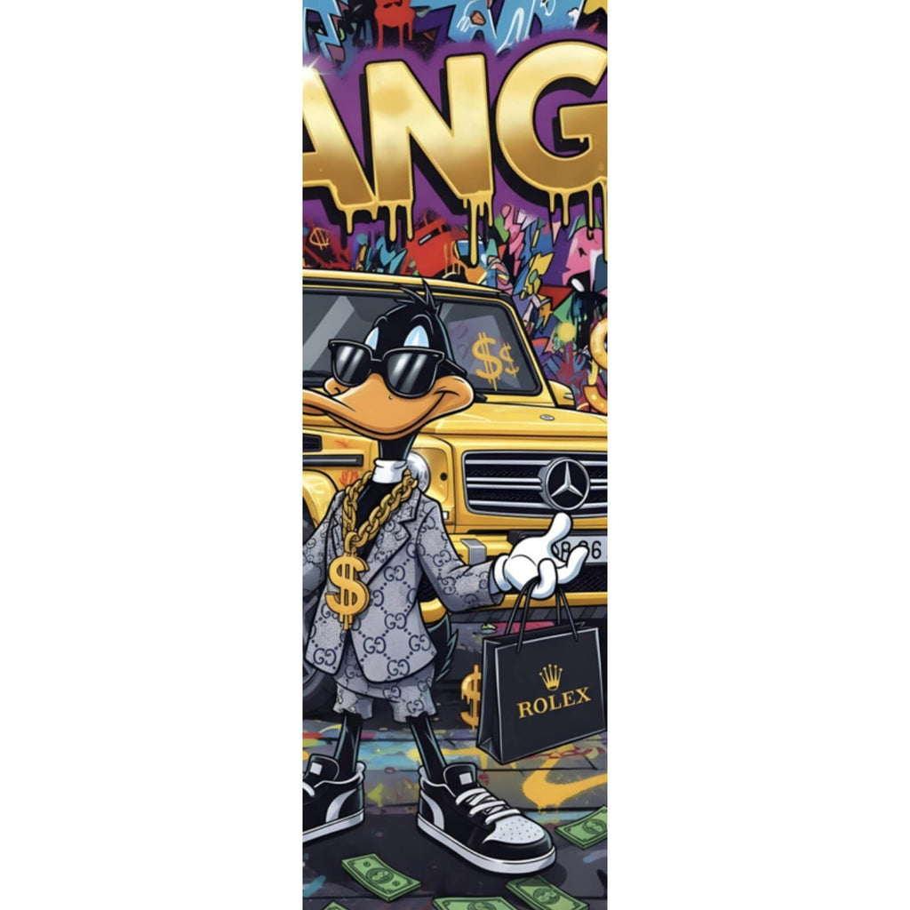 Dieses beeindruckende Wandbild vereint Elemente von Pop Art und modernem Stil, indem es eine ikonische Ente darstellt, die vor einem luxuriösen Auto posiert. Die Ente trägt auffällige Markenbekleidung und Accessoires, die sofort ins Auge springen und einen Hauch von Glamour und Luxus ausstrahlen. Umgeben von symbolträchtigen Logos und Geldscheinen erzeugt das Bild eine dynamische und lebendige Atmosphäre, die den Betrachter in eine Welt des Reichtums und der Opulenz entführt. Der Hintergrund ist mit Graffiti-Elementen und farbenfrohen Spritzern gestaltet, die der Szene Tiefe und Bewegung verleihen. Die Kombination aus bekannten Markensymbolen und urbanem Design macht dieses Bild zu einem echten Hingucker, der in jedem Raum ein modernes und trendiges Ambiente schafft. Die Darstellung spielt mit Humor und Extravaganz und ist ideal für Räume, die einen kreativen und modischen Akzent benötigen. Die Materialanmutung ist hochwertig und vermittelt eine hochwertige und edle Ausstrahlung. Dieses Kunstwerk ist perfekt für alle, die ein starkes Statement setzen möchten und ihren Raum mit einem einzigartigen und stilvollen Kunstwerk bereichern wollen.